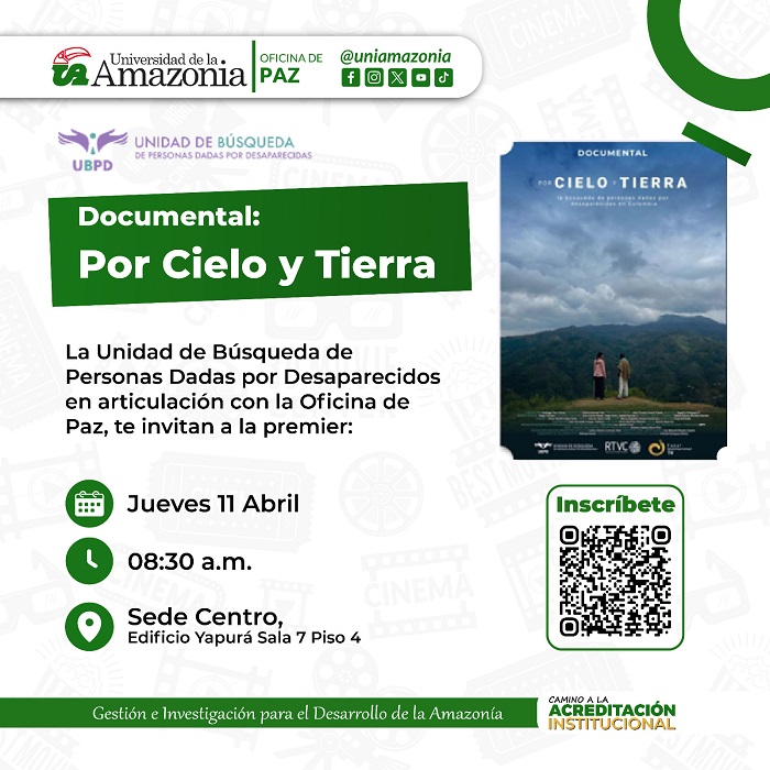 Desde la Oficina de Paz de la Universidad de la Amazonia en articulación con la Unidad de búsquedas de personas dadas por desaparecidas, hacemos extensiva la invita a la comunidad universitaria para que participen del Documental por cielo y tierra, la búsqueda de las personas dadas por desaparecidas en Colombia, que se llevará a cabo el día jueves 11 de abril de a las 8:30 am, en la sede centro, edificio Yapura Sala 7 piso 4.