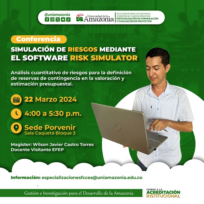 CONFERENCIA: Simulación de Riesgos mediante el software RISK SIMULATOR dirigida por el Mg. WILSON JAVIER CASTRO TORRES, de la Universidad Piloto Bogotá, docente invitado del programa ESPECIALIZACIÓN EN FORMULACIÓN Y EVALUACIÓN DE PROYECTOS.