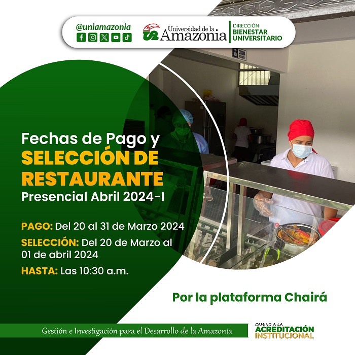 La Universidad de la Amazonia desde la Dirección de Bienestar Universitario área de Promoción y Apoyo Socioeconómico, informa a los estudiantes beneficiarios del programa subsidio alimentario, que se encuentra habilitada la plataforma Chairá para realizar el pago y posterior selección de restaurante para el mes de abril.