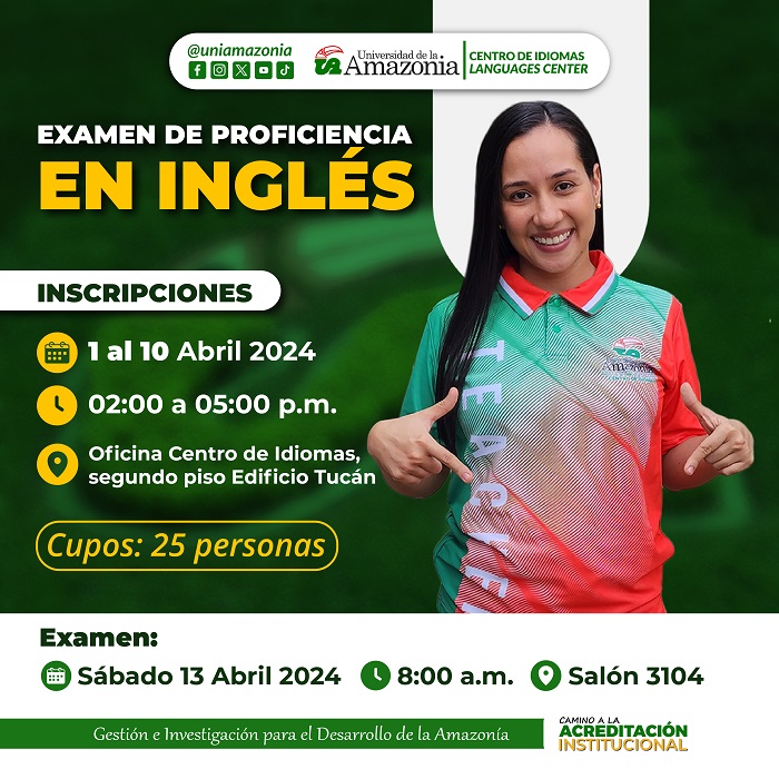 NOTA ACLARATORIA: El cupo de inscripción es de 25 estudiantes y este examen aplica para los estudiantes de pregrado de la Universidad de la Amazonia que no tienen inmerso en su plan de estudio la materia de INGLÉS.