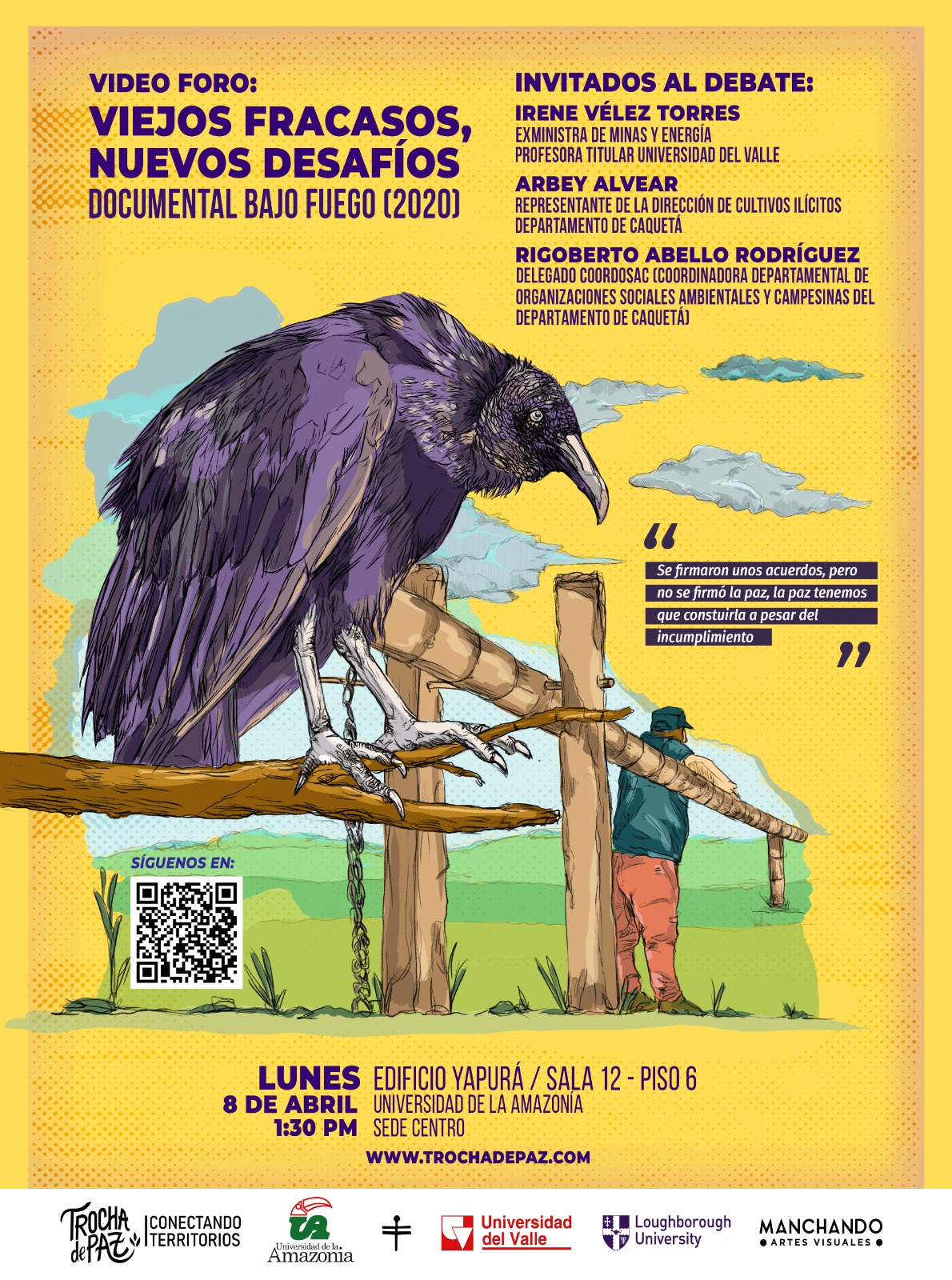Desde la Oficina de Paz de la Universidad de la Amazonia en articulación con la Universidad del valle, hacemos extensiva la invita a la comunidad universitaria para que participen del video foro “viejos fracasos nuevos desafíos en la sustitución de cultivos ilícitos”, y el documental “bajo fuego”, que se llevará a cabo el día lunes 8 de abril de 1:30 pm a 5:00 pm, donde tendremos invitados especiales.