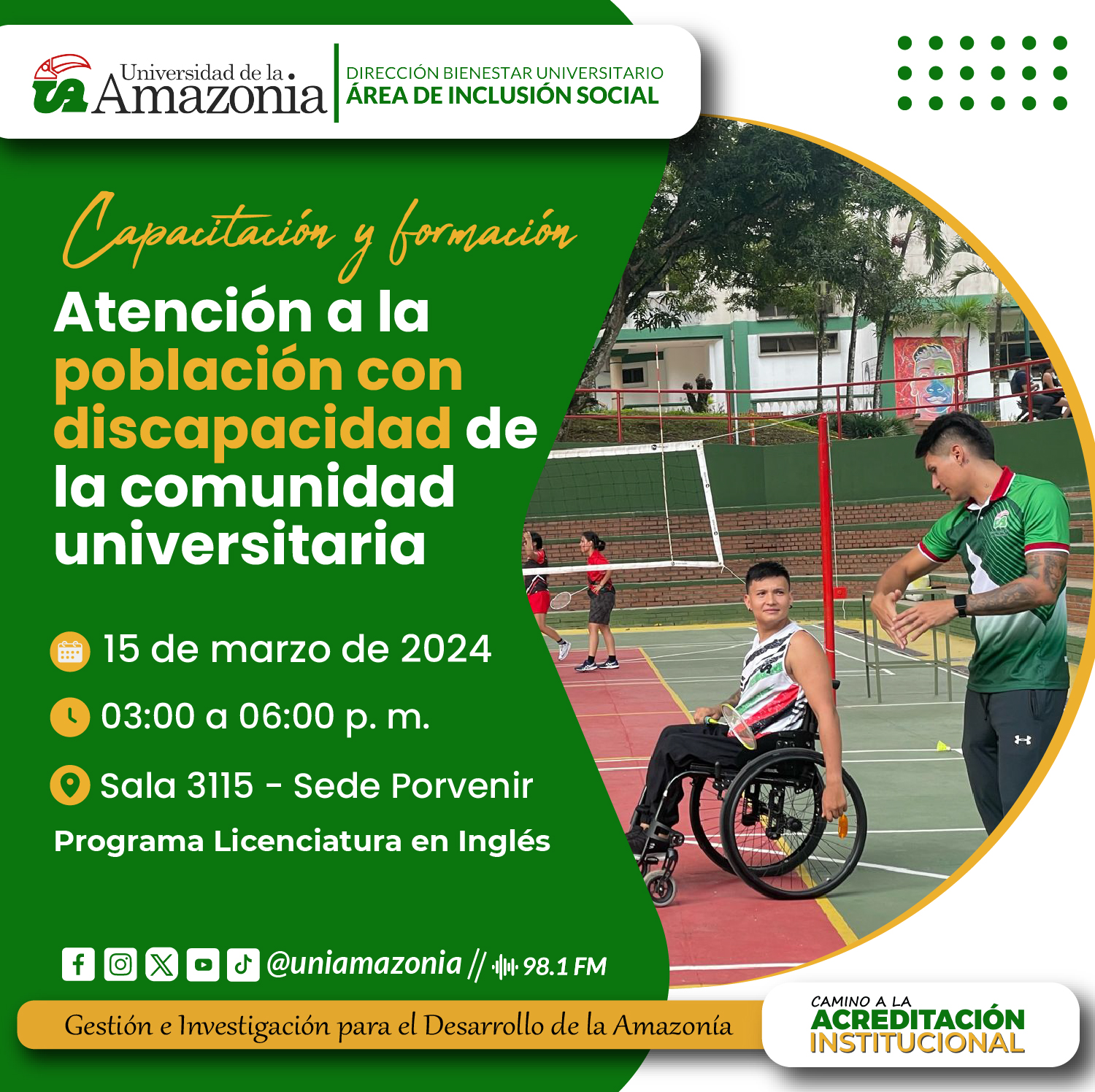 Desde la Dirección de Bienestar Universitario el área de inclusión social , invita a la Comunidad estudiantil a participar en la capacitación y formación en atención a la población con discapacidad, dando cumplimiento a la " Política institucional en la atención de las personas con discapacidad en el marco de la educación inclusiva de la Universidad de la Amazonia, acuerdo 081 de 2022