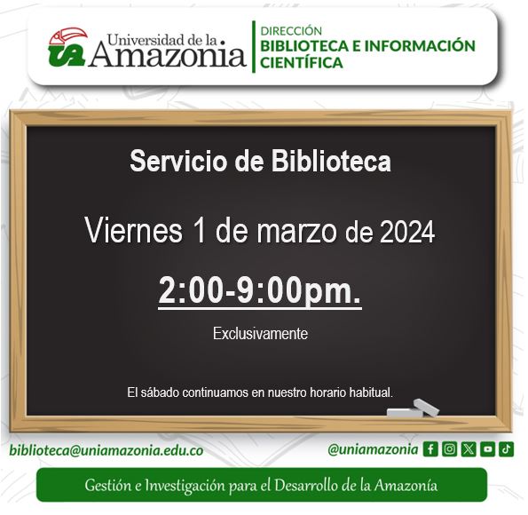 La universidad de la Amazonia se permite informar que el día Viernes 1 de marzo de 2024 se prestara el servicio de biblioteca de 2:00pm a 9:00 pm.