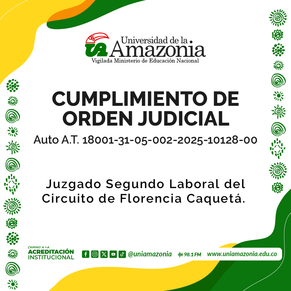En cumplimiento de la orden judicial impartida por el Juzgado Segundo Laboral del Circuito de Florencia Caquetá, la Universidad de la Amazonia da a conocer el Auto A.T. 18001-31-05-002-2025-10128-00 del 25 de noviembre de 2025 con ocasión a la acción de tutela presentada por el señor Víctor Javier Díaz Cruz contra de la Universidad de la Amazonia.