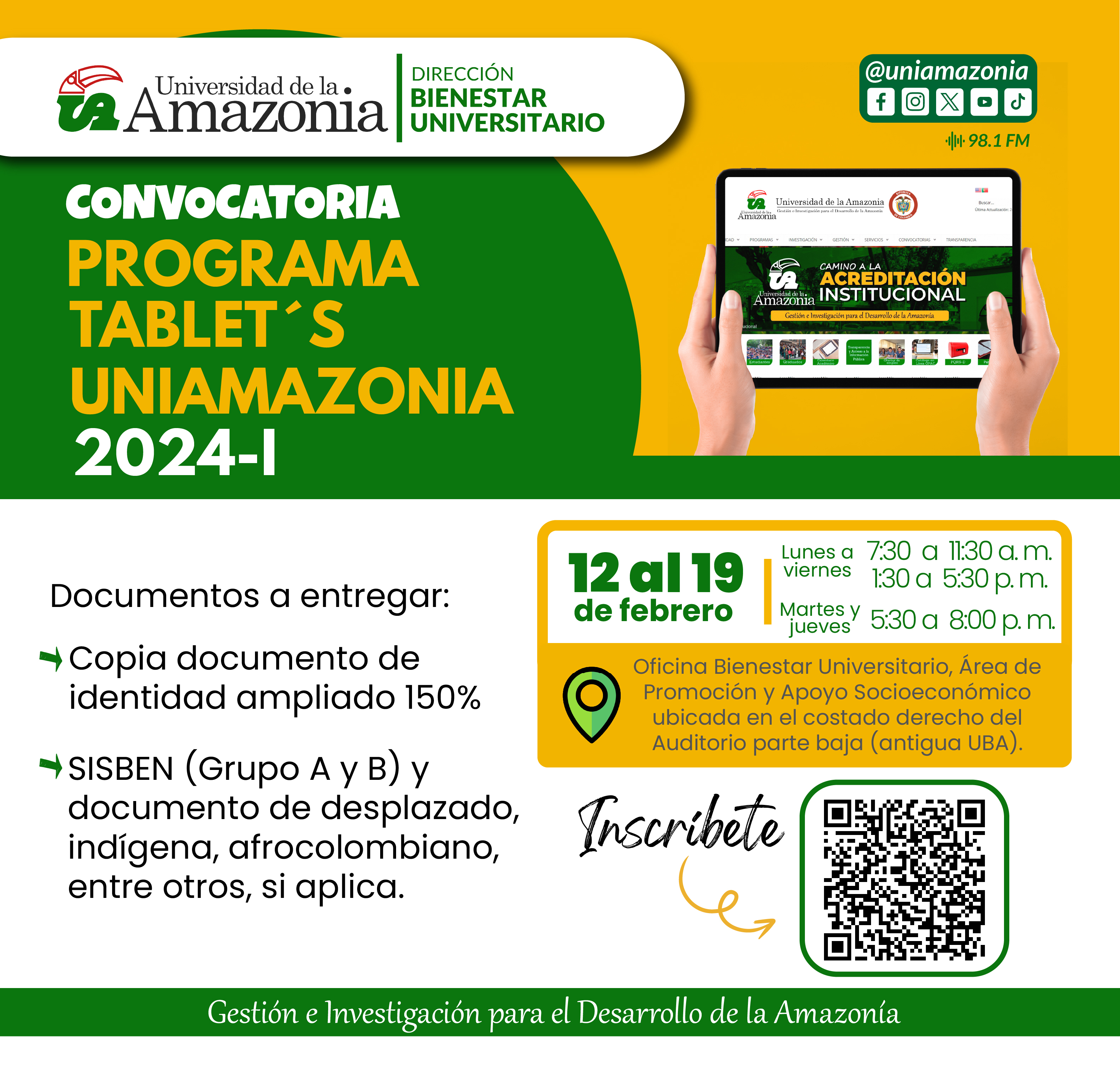 La Universidad de la Amazonia desde la Dirección de Bienestar Universitario, área de Promoción y Apoyo Socioeconómico, da a conocer a la comunidad estudiantil interesada, que se da inicio a la convocatoria del Programa TABLET´S UNIAMAZONIA para el periodo 2024-I: