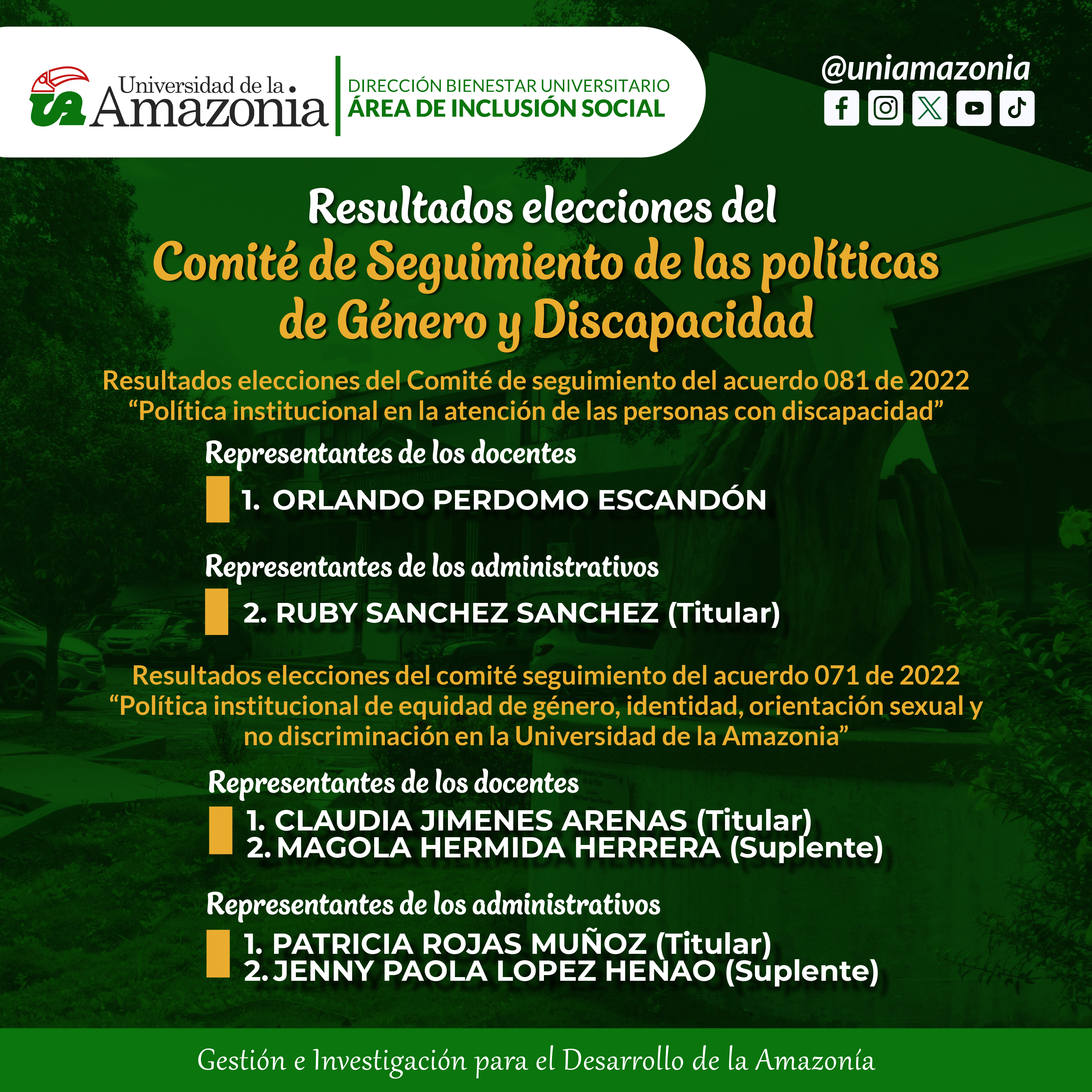 Desde la Dirección de bienestar Universitario, el área de inclusión da a conocer resultados de las elecciones del comité de seguimiento del acuerdo 071 de 2022 "Política institucional de equidad de Genero, identidad, orientación sexual y no discriminación en la Universidad de la Amazonia" y acuerdo 081 de 2022" Política institucional en la atención de las personas con Discapacidad"