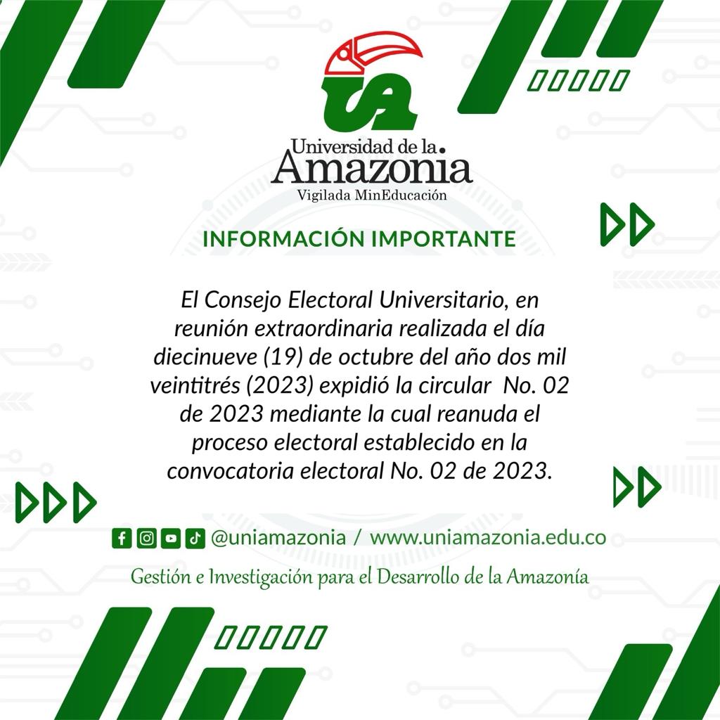 El Consejo Electoral Universiario, en reunión extraordinaria realizada el día diecinueve (19) de octubre del año dos mil veintitres (2023) expidió circular No. 02 de 2023 mediante la cual reanuda el proceso electoral establecido en la Convocatoria Electoral No. 02 de 2023.