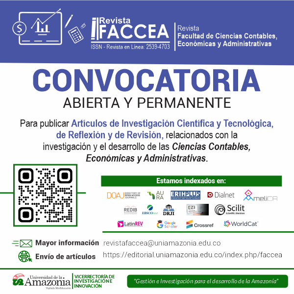 El Comité Editorial de la Revista FACCEA de la Facultad de Ciencias Contables, Económicas y Administrativas les extiende la invitación a postular sus artículos de INVESTIGACIÓN CIENTÍFICA Y TECNOLÓGICA, ARTÍCULO DE REVISIÓN y ARTÍCULOS DE REFLEXIÓN relacionados con estudios e investigaciones sobre teorías, metodologías y aplicaciones en áreas de las Ciencias Contables, Económicas y Administrativas. No duden en escribirnos a (Esta dirección de correo electrónico está protegida contra spambots. Usted necesita tener Javascript activado para poder verla.) o enviar sus manuscritos a través de la plataforma Open Journal System que posee la Universidad de la Amazonia. Ver Revista