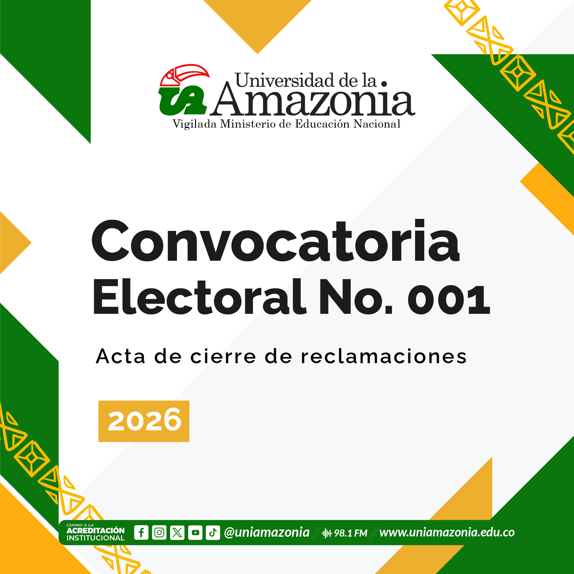 Florencia (Caquetá), siendo las cinco y treinta (05:30 p.m.) hora legal colombiana del día veinte (20) de febrero del dos mil veintiséis (2026), se informa que, durante el periodo comprendido entre el 18, 19 y 20 de febrero de 2026 no se presentaron subsanaciones y/o reclamaciones de forma física en la Secretaria General de la Universidad de la Amazonia,