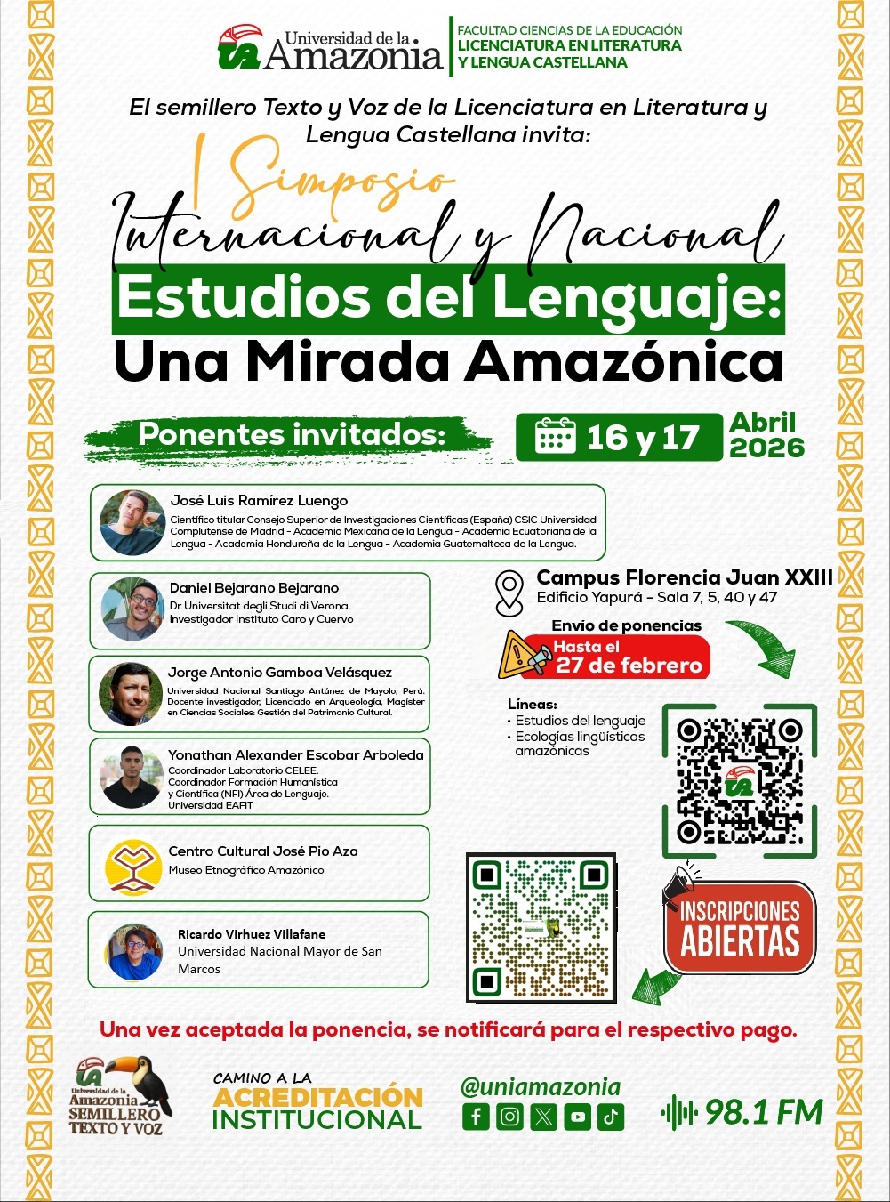 El semillero Texto y voz de la Licenciatura en Literatura y Lengua Castellana invita a la comunidad académica a participar del I Simposio internacional y nacional de estudios del lenguaje: una mirada amazónica, que tendrá lugar los días 16 y 17 de abril en la Universidad de la Amazonia, Campus Florencia Juan XXIII, Edificio Yapurá. El evento se concibe como un espacio académico de formación, reflexión y divulgación científica orientado al fortalecimiento de las competencias investigativas de estudiantes y docentes del área del lenguaje y la literatura.