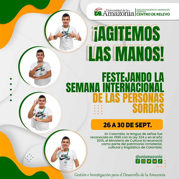 ¡Celebramos a nuestros compañeros, estudiantes, amigos, familiares... SORDOS!. Gracias por el privilegio de contar con ustedes, y enseñarnos una nueva forma de comunicarnos a través de la Lengua de Señas. En la Biblioteca contamos con Oscar Andres Montenegro, funcionario sordo, quien con todo gusto podrá atenderles.