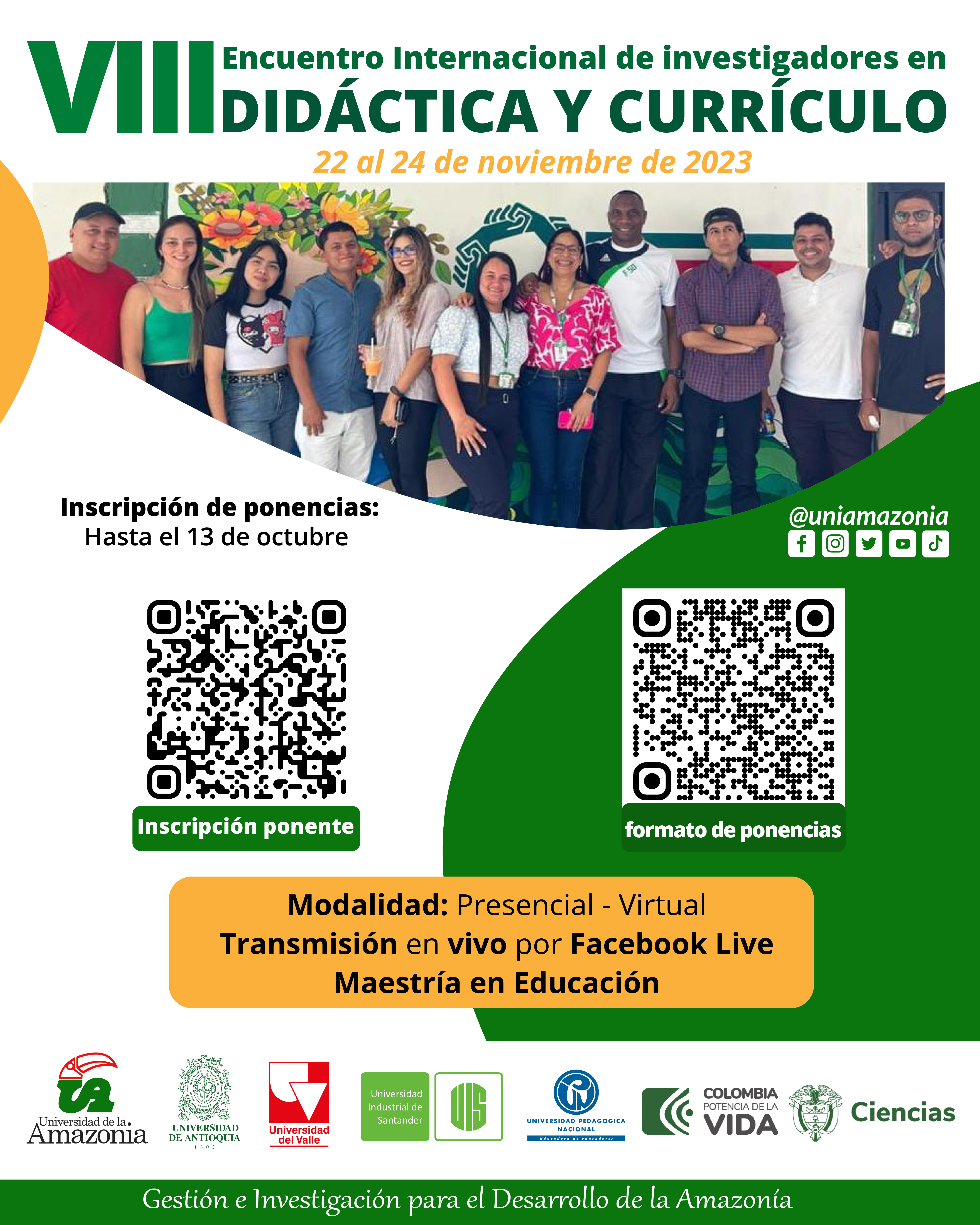 La Maestría en Educación y el Doctorado en Educación y Cultura Ambiental de la Universidad de la Amazonia, invitan a toda la comunidad educativa a participar en el VIII Encuentro de Investigadores en Didáctica y Currículo. Su objetivo es socializar y divulgar la producción intelectual y los resultados parciales o finales de investigaciones, ante todo, en didácticas o currículo.