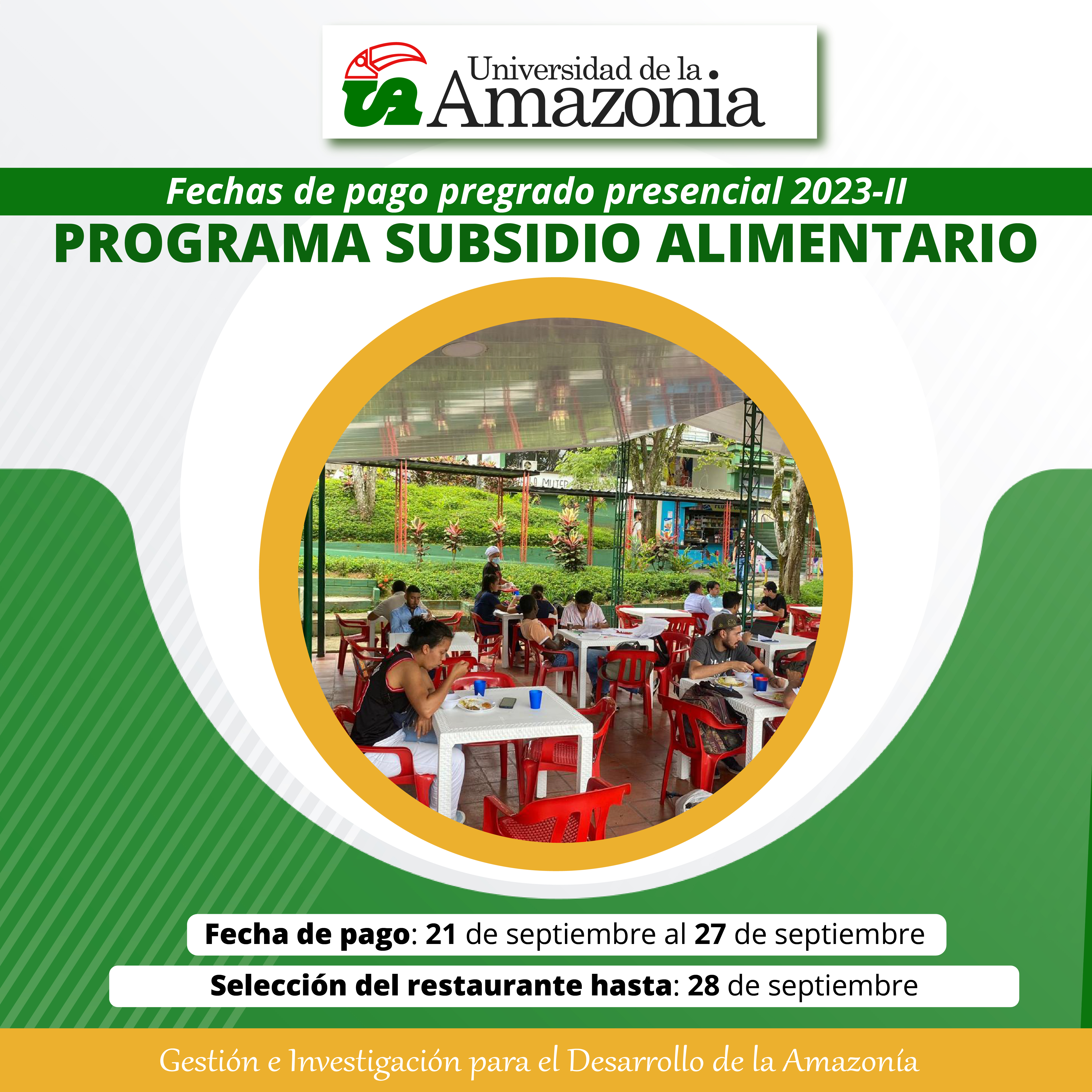 La Universidad de la Amazonia desde la Dirección de Bienestar Universitario área de Promoción y Apoyo Socioeconómico, informa a los estudiantes beneficiarios del programa subsidio alimentario, que se encuentra habilitada la plataforma Chairá para realizar el pago del servicio de alimentación y selección de restaurante.