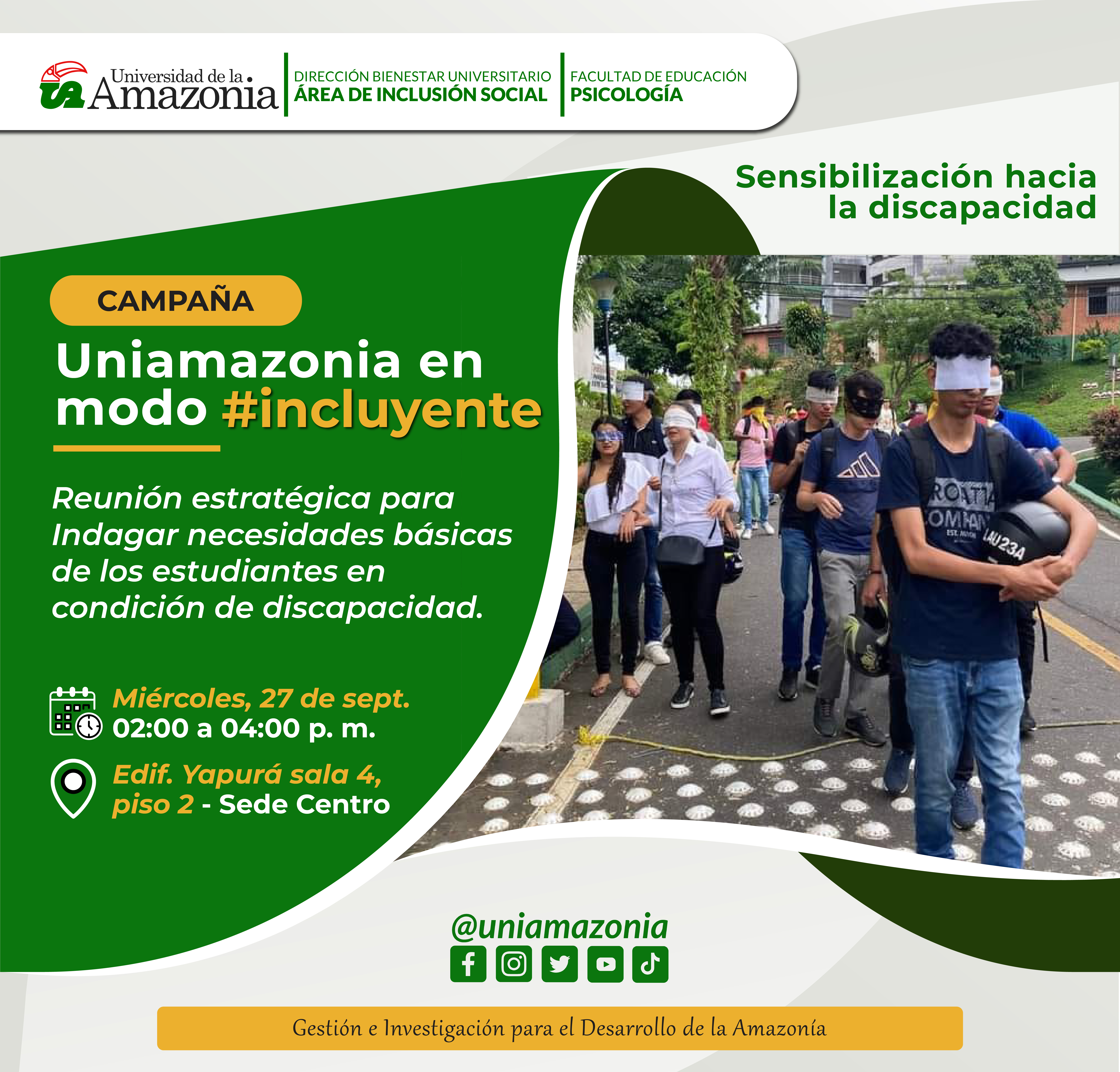 Desde la Dirección de Bienestar Universitario el Área de Inclusión Social invita a la Comunidad Universitaria en condición de Discapacidad a participar en el encuentro para socializar la propuesta de campaña de sensibilización hacia la discapacidad "Universidad modo #incluyente"