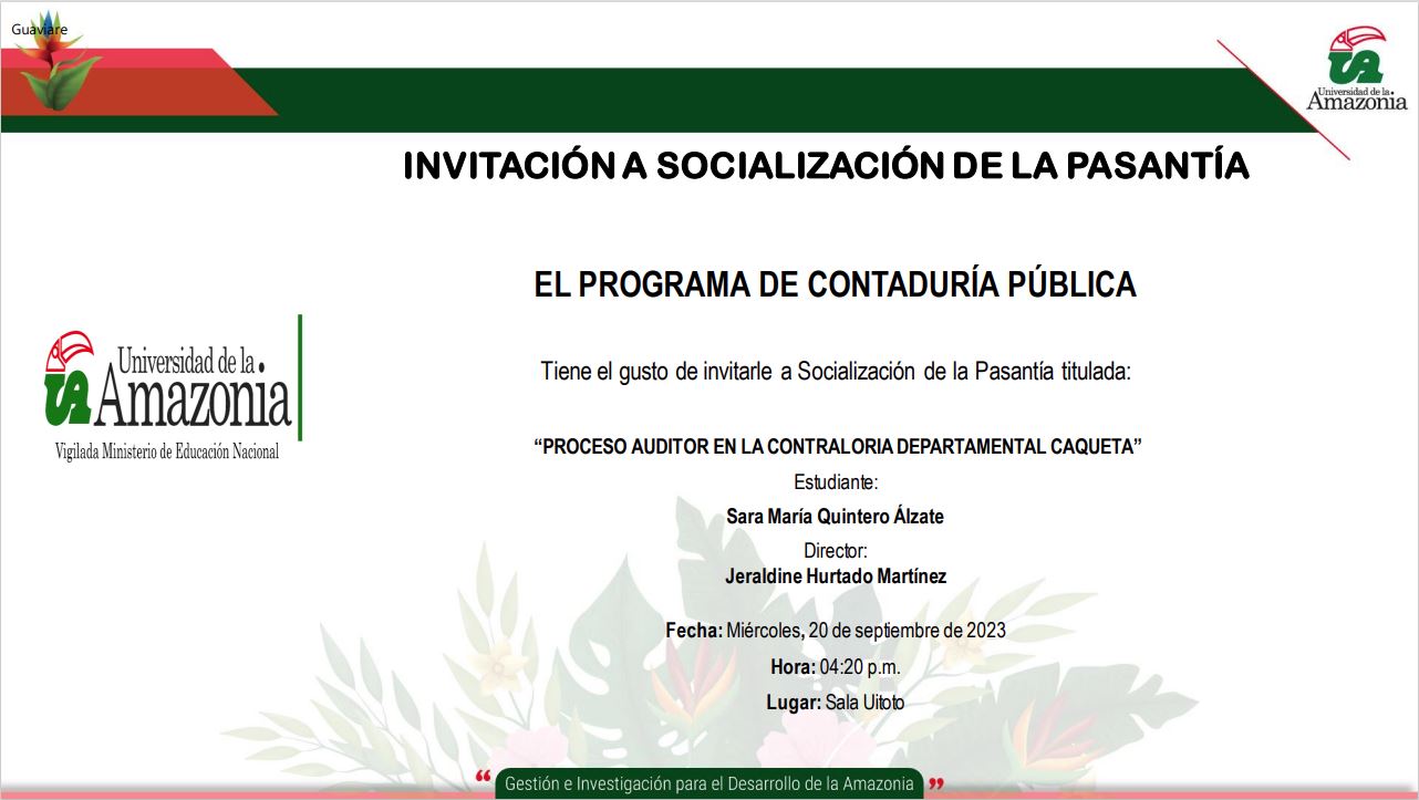 Programa de Contaduría Pública tiene el gusto de invitarle a la socialización de la Pasantía, titulado “PROCESO AUDITOR EN LA CONTRALORÍA DEPARTAMENTAL CAQUETA”
