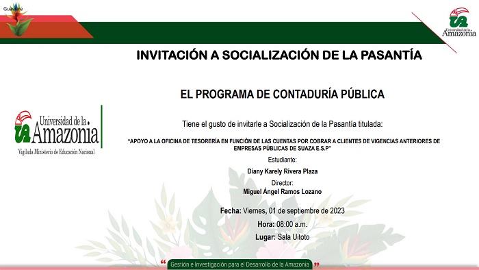 Programa de Contaduría Pública tiene el gusto de invitarle a la sustentación del Trabajo de Grado, titulado “APOYO A LA OFICINA DE TESORERÍA EN FUNCIÓN DE LAS CUENTAS POR COBRAR A CLIENTES DE VIGENCIAS ANTERIORES DE EMPRESAS PÚBLICAS DE SUAZA E.S.P”.
