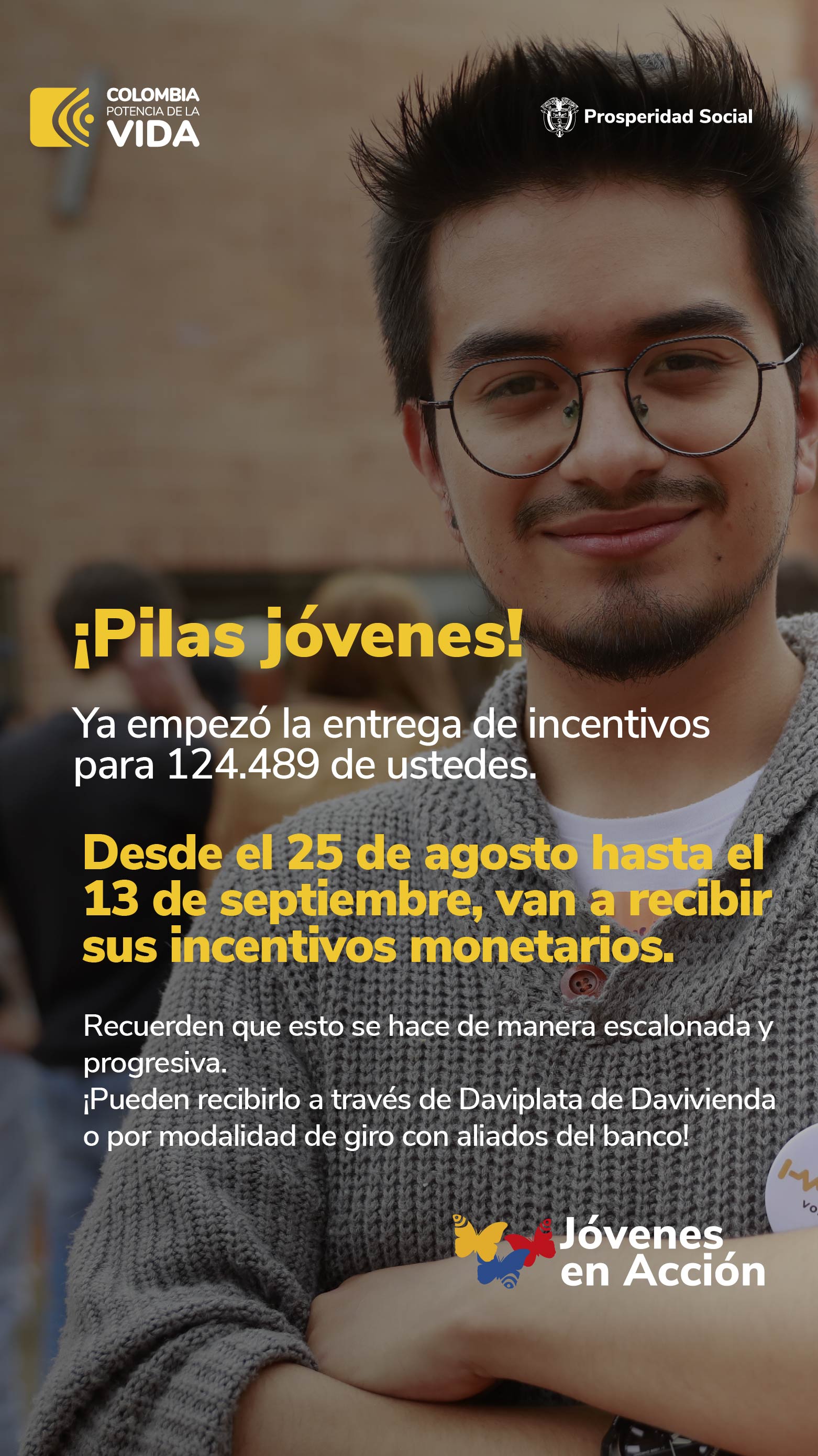 #Atención #JovenesEnAccion: desde este viernes 25 de agosto y hasta el 13 de septiembre, realizaremos el cuarto pago de incentivos de 2023 a través de @daviplataoficial o giro. Recuerden: deben esperar a que llegue el mensaje de texto en el que se notifica el lugar y fecha para reclamarlos.