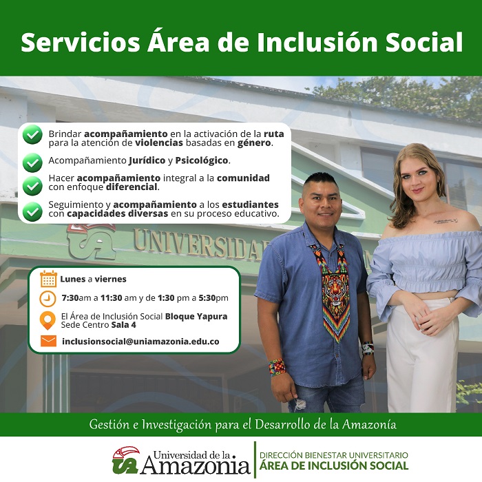 La Universidad de la Amazonia a través de la División de Bienestar Universitario presenta a toda la Comunidad Universitaria, la oferta de servicios del Área de Inclusión Social.