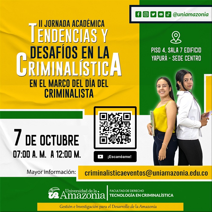 En el marco de la celebración del día internacional del Criminalista, el programa de la Tecnología en Criminalística y la Facultad de Derecho de la Universidad de la Amazonia, se complacen en invitar a la comunidad en general para participar de la II JORNADA ACADÉMICA “TENDENCIAS Y DESAFÍOS EN LA CRIMINALÍSTICA” a llevarse a cabo el día 7 de Octubre de 2023 en la Universidad de la Amazonia.