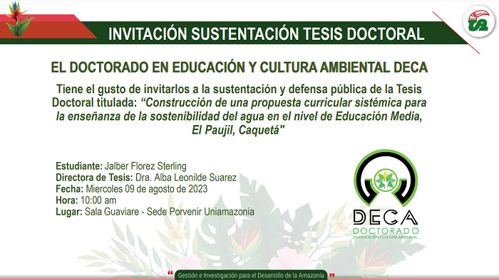 El Doctorado en Educación y Cultura Ambiental, tiene el gusto de invitarlos a la sustentación y defensa pública de la tesis Doctoral titulada: "Construcción de una propuesta curricular sistémica para la enseñanza de la sostenibilidad del agua en el nivel de Educación Media, El Paujil, Caquetá ",  del estudiante Jalber Florez Sterling.