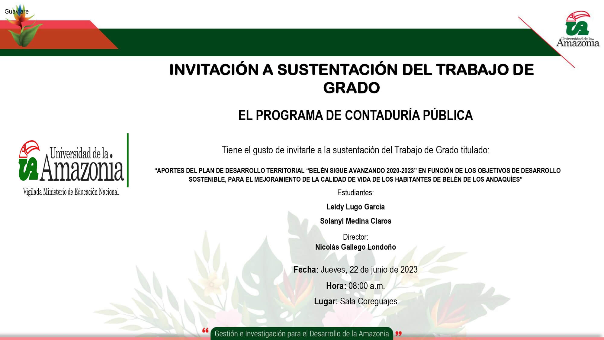 El Programa de Contaduría Pública tiene el gusto de invitarle a la sustentación del Trabajo de Grado, titulado “APORTES DEL PLAN DE DESARROLLO TERRITORIAL “BELÉN SIGUE AVANZANDO 2020-2023” EN FUNCIÓN DE LOS OBJETIVOS DE DESARROLLO SOSTENIBLE, PARA EL MEJORAMIENTO DE LA CALIDAD DE VIDA DE LOS HABITANTES DE BELÉN DE LOS ANDAQUÍES”.