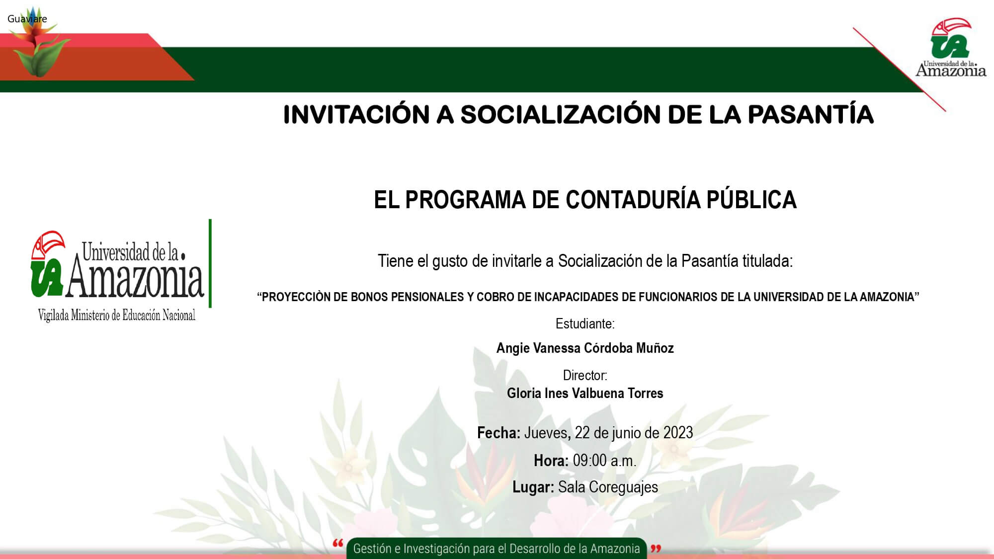 El Programa de Contaduría Pública tiene el gusto de invitarle a la socialización de la Pasantía, titulada “PROYECCIÒN DE BONOS PENSIONALES Y COBRO DE INCAPACIDADES DE FUNCIONARIOS DE LA UNIVERSIDAD DE LA AMAZONIA”.