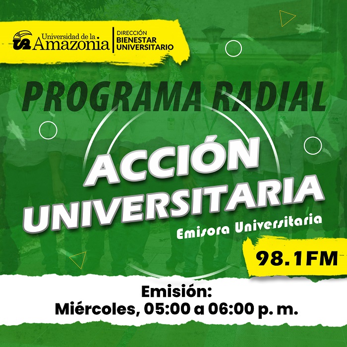 La Dirección de Bienestar Universitario invita a toda la comunidad en general para que Sintonice y escuche ACCIÓN UNIVERSITARIA, un espacio radial para informar nuestro Portafolio de Servicios, eventos en las diferentes áreas como Artes, Deportes, Salud, Inclusión Social, Desarrollo Humano, y Promoción & Apoyo Socioeconómico; además de las actividades institucionales especiales para la comunidad universitaria, así como de extensión y proyección social.