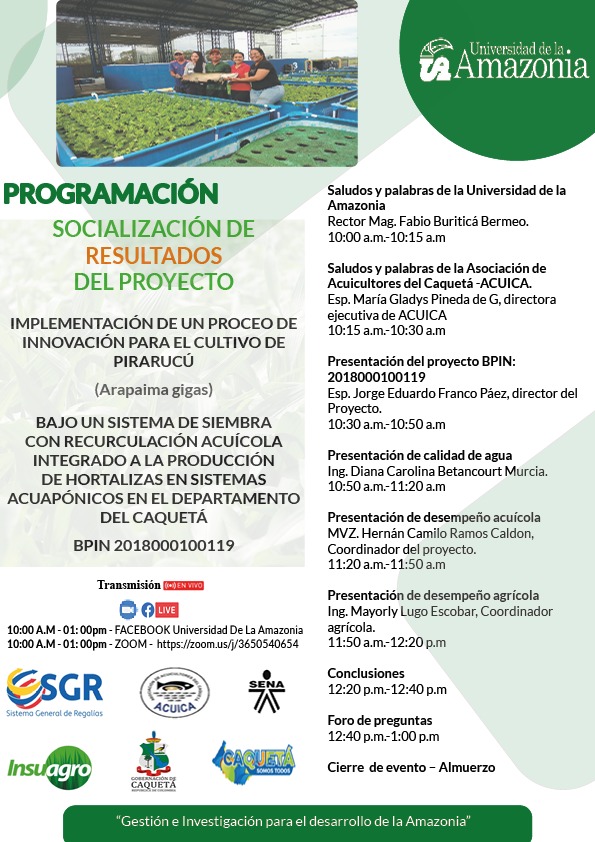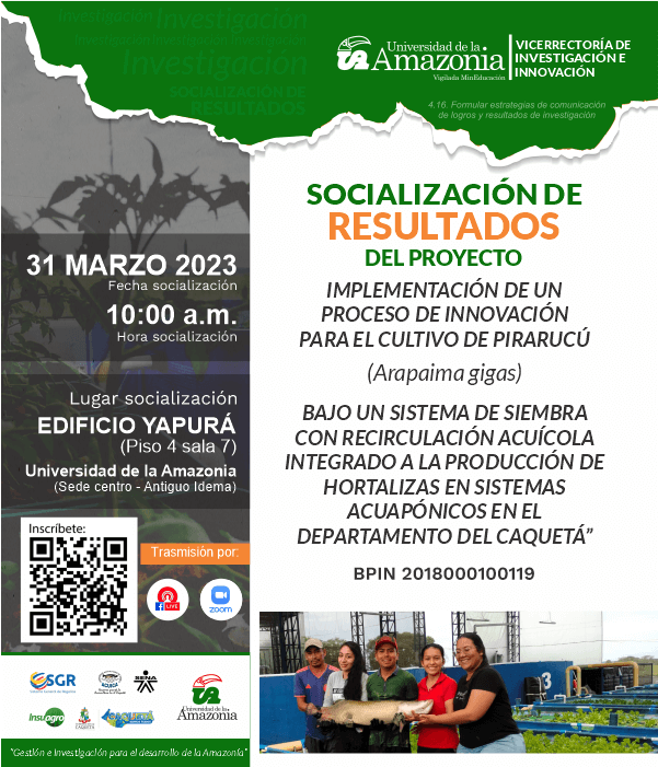 La Universidad de la Amazonia invita a participar de la socialización de resultados del proyecto denominado “IMPLEMENTACIÓN DE UN PROCESO DE INNOVACIÓN PARA EL CULTIVO DE PIRARUCÚ (Arapaima gigas) BAJO UN SISTEMA DE SIEMBRA CON RECIRCULACIÓN ACUÍCOLA INTEGRADO A LA PRODUCCIÓN DE HORTALIZAS EN SISTEMAS ACUAPÓNICOS EN EL DEPARTAMENTO DEL CAQUETÁ” BPIN 2018000100119 financiado por el Sistema General de regalías del Fondo de Ciencia, Tecnología e Innovación, el cual se va a realizar el día 31 de marzo en la sede Centro de la Universidad de la Amazonia y se transmitirá por Facebook live y zoom.