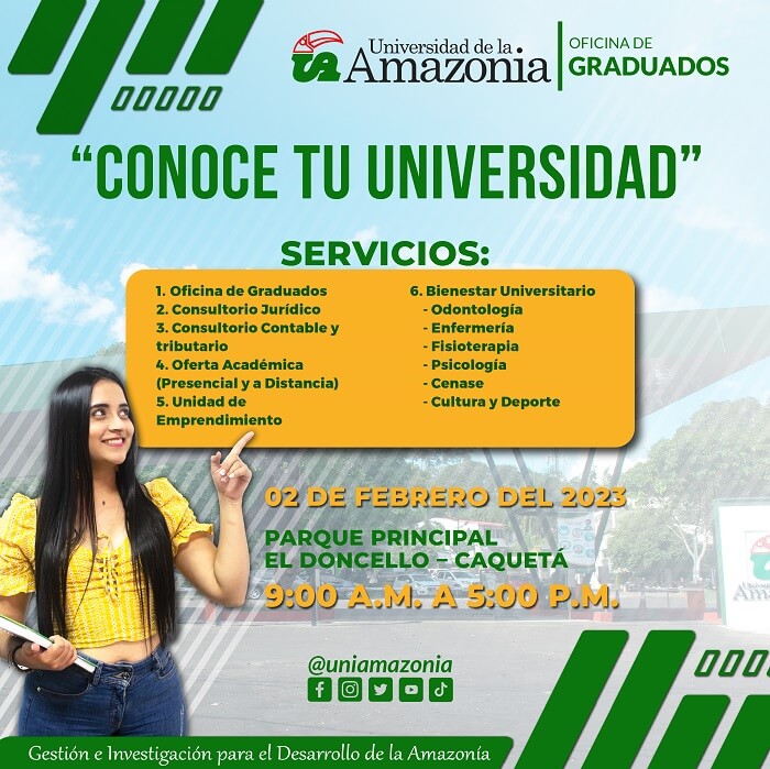 La Universidad de la Amazonia, desde la Oficina de Graduados invita a toda la comunidad del Municipio de El Doncello a participar de “ La Gran Feria Conoce Tu Universidad”, la cual se llevará a cabo este jueves 2 de Febrero desde las 9:00 a. m. hasta las 5:00 p. m.