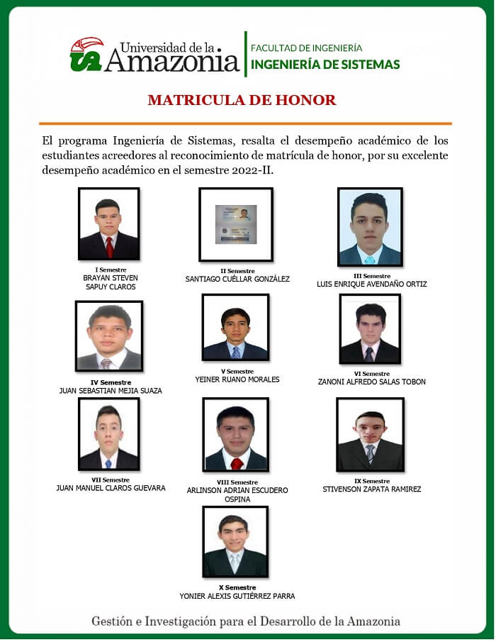 El programa Ingeniería de Sistemas, resalta el desempeño académico de los estudiantes acreedores al reconocimiento de matrícula de honor, por su excelente desempeño académico en el semestre 2022-II.