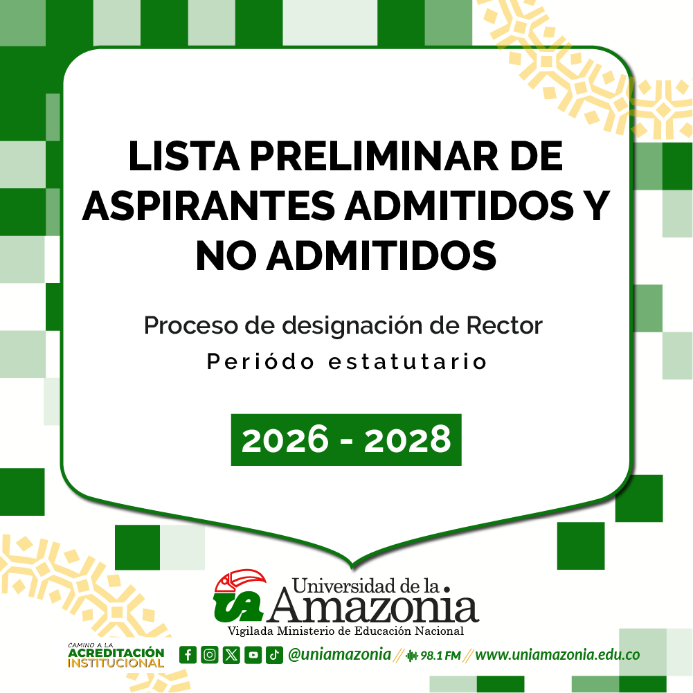 El Consejo Superior Universitario de la Universidad de la Amazonia, en sesión extraordinaria celebrada el día diez (10) de octubre del año dos mil veinticinco (2025) de conformidad con lo establecido en el Acuerdo Superior No. 054 de 2025 “Por medio del cual se establece el calendario del proceso de designación de Rector de la Universidad de la Amazonia para el periodo estatutario 2026 – 2028”, y en cumplimiento del calendario fijado, procedió a verificar los requisitos de los aspirantes inscritos.