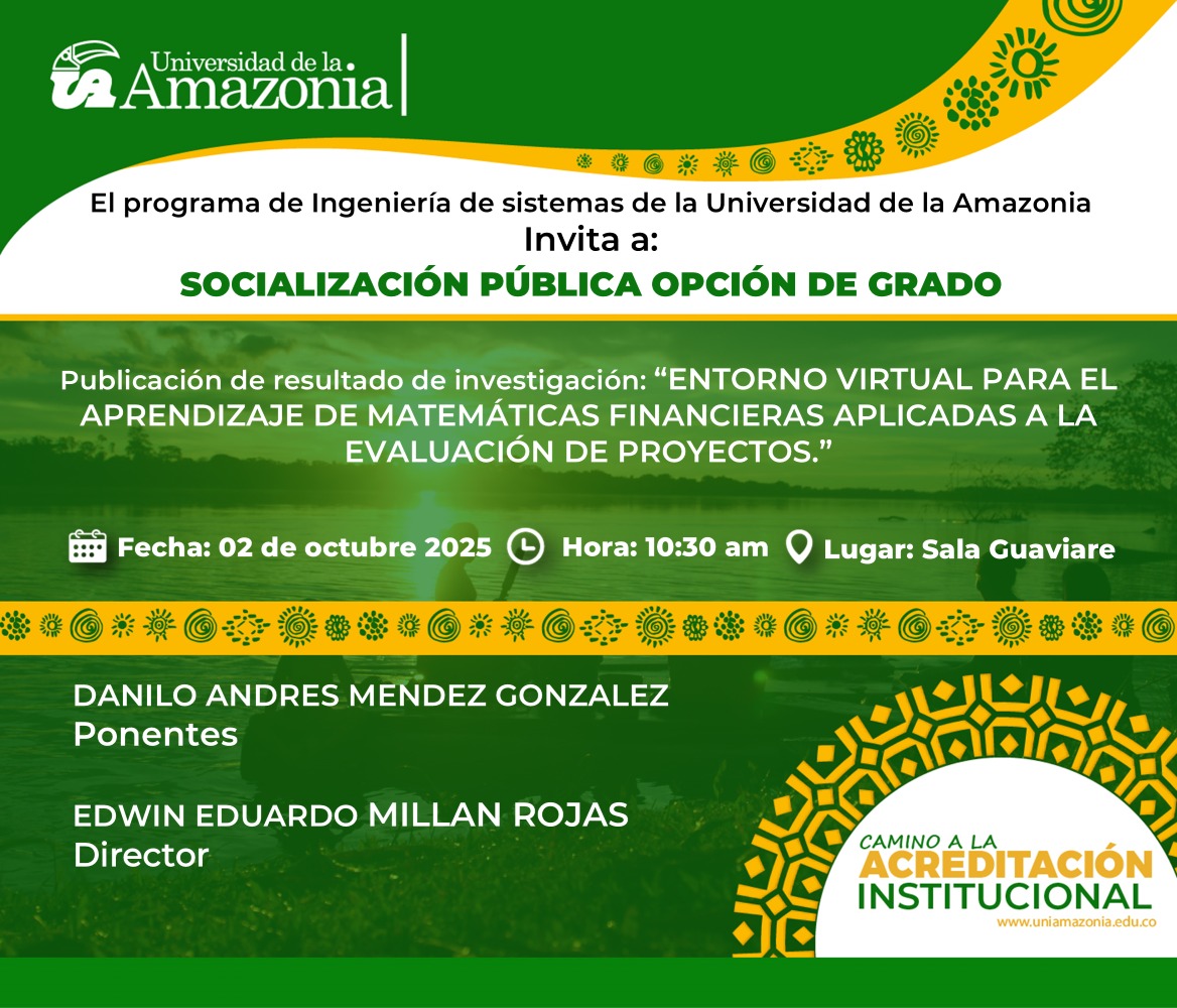La Universidad de la Amazonia, a través del programa de Ingeniería de Sistemas, tiene el agrado de invitar a la comunidad universitaria y al público en general a la socialización de trabajos de Grado a realizarse en el marco del Seminario de Investigación.