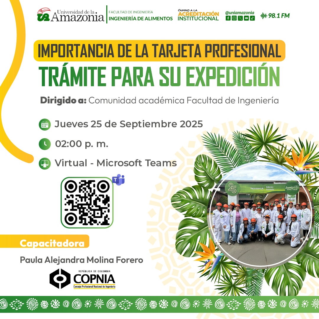 La Facultad de Ingeniería y su Programa de Ingeniería de Alimentos, en articulación con el Consejo Profesional Nacional de Ingeniería #COPNIA, te invitan al encuentro virtual sobre: