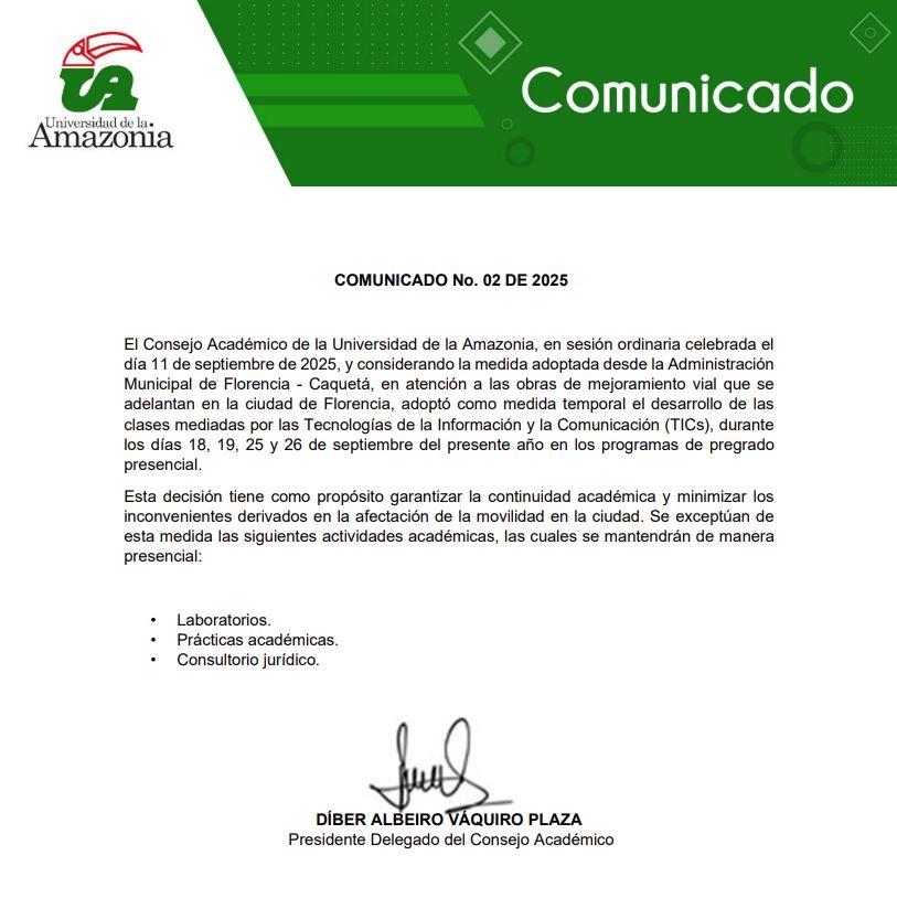 El consejo Académico de la Universidad de la Amazonia da a conocer el Comunicado No. 02 del 11 de septiembre de 2025, en el que se presentan las medidas adoptadas para el desarrollo de actividades académicas, teniendo en cuenta las obras de mejoramiento vial que se adelantan en la ciudad de Florencia, Caquetá.