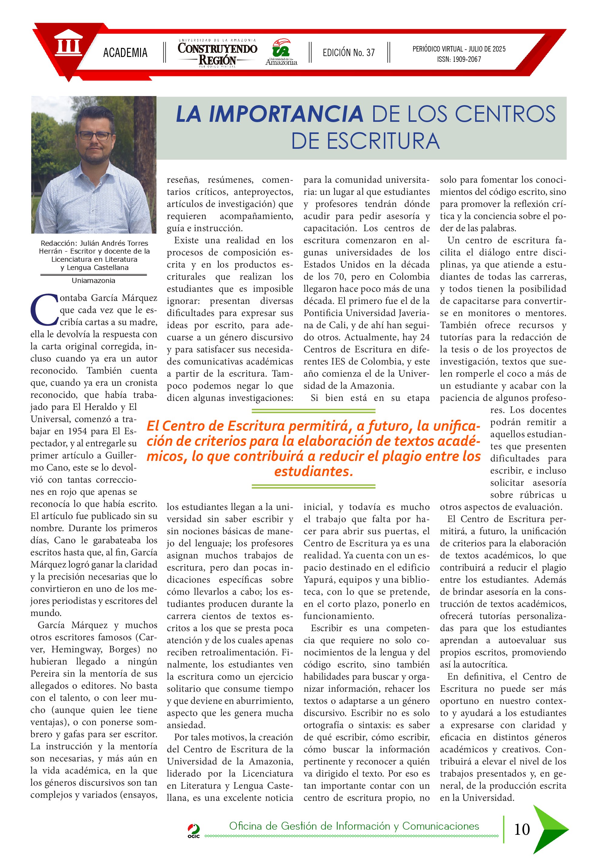 Artículo No 10. En esta edición reflexionamos sobre el papel fundamental que cumplen los Centros de Escritura en las instituciones de educación superior. Desde la Universidad de la Amazonia, se impulsa la creación y consolidación de estos espacios para que los estudiantes no solo escriban, sino que se expresen con claridad, argumenten con solidez y conecten su voz con el conocimiento.