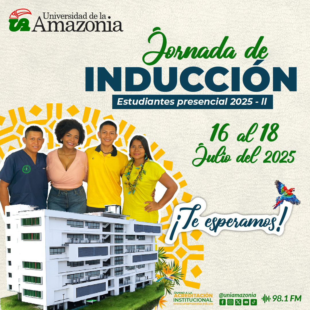 La Universidad de la Amazonia da una cordial bienvenida a los nuevos estudiantes de Pregrado Presencial Florencia. Les invitamos a participar en la Jornada de Inducción 2025-II, del 16 al 18 de julio, donde podrán conocer nuestra comunidad académica y dar inicio a una etapa llena de aprendizaje y crecimiento.