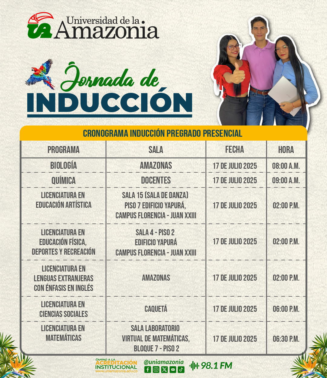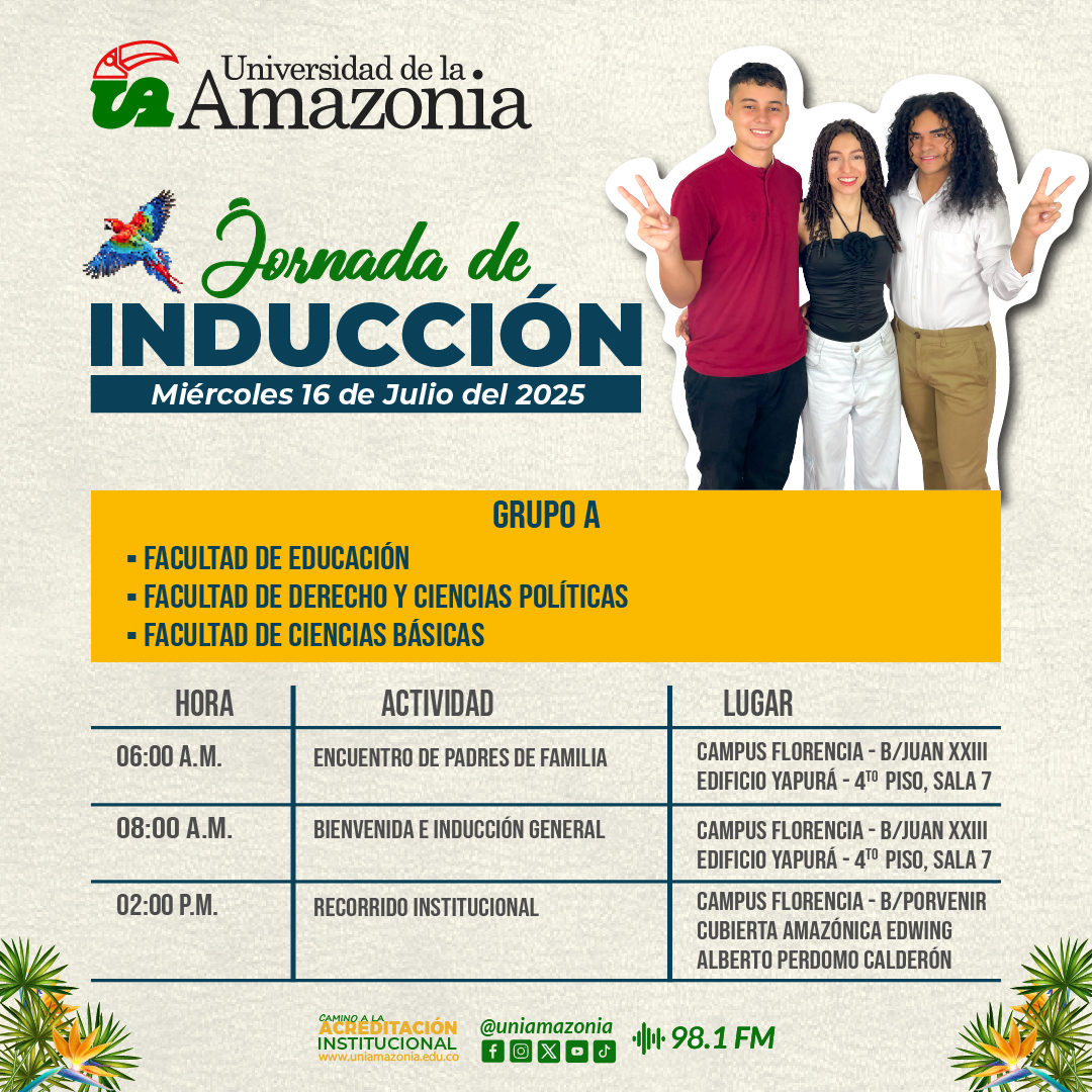 La Universidad de la Amazonia se complace en invitar a todos los estudiantes admitidos en los Programas de Pregrado Presencial Florencia al desarrollo de la Jornada de Inducción 2025, que se llevará a cabo el día 17 y 18 de julio de 2025, según la programación establecida por cada programa académico.