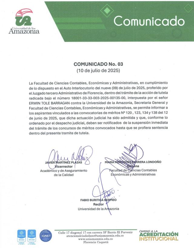 De conformidad con el Calendario Académico para el desarrollo de las actividades correspondientes al segundo período académico de 2025 II, en los Programas de Pregrado presencial y a distancia ofertados en Florencia, se publica la reasignación de cupos no matriculados, tercer llamado en los programas que aplique.