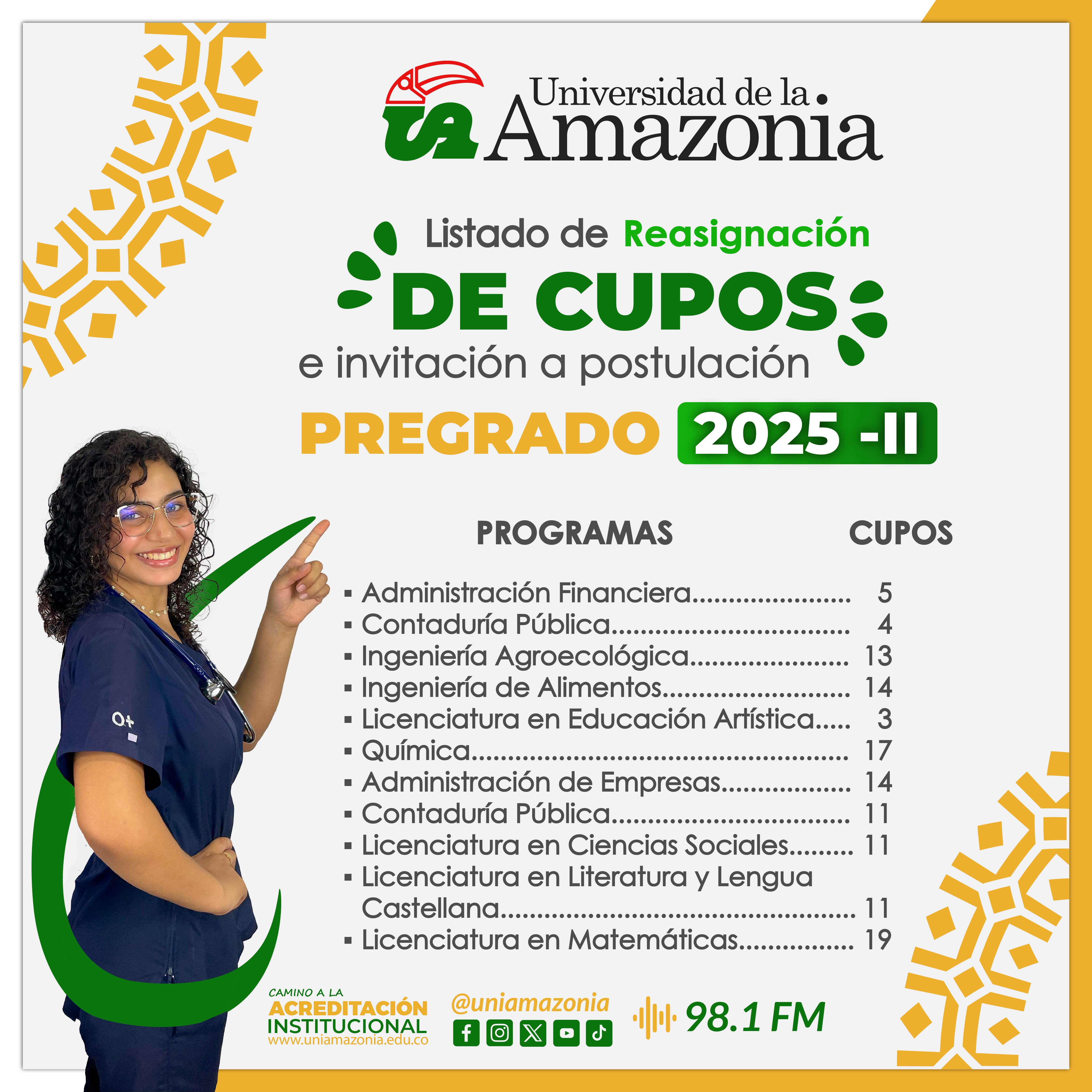 De conformidad con el Calendario Académico para el desarrollo de las actividades correspondientes al segundo período académico de 2025-II, en los Programas de Pregrado presencial y a distancia ofertados en Florencia, se publica la reasignación de cupos no matriculados e invitación a postulación en los programas que aplique.