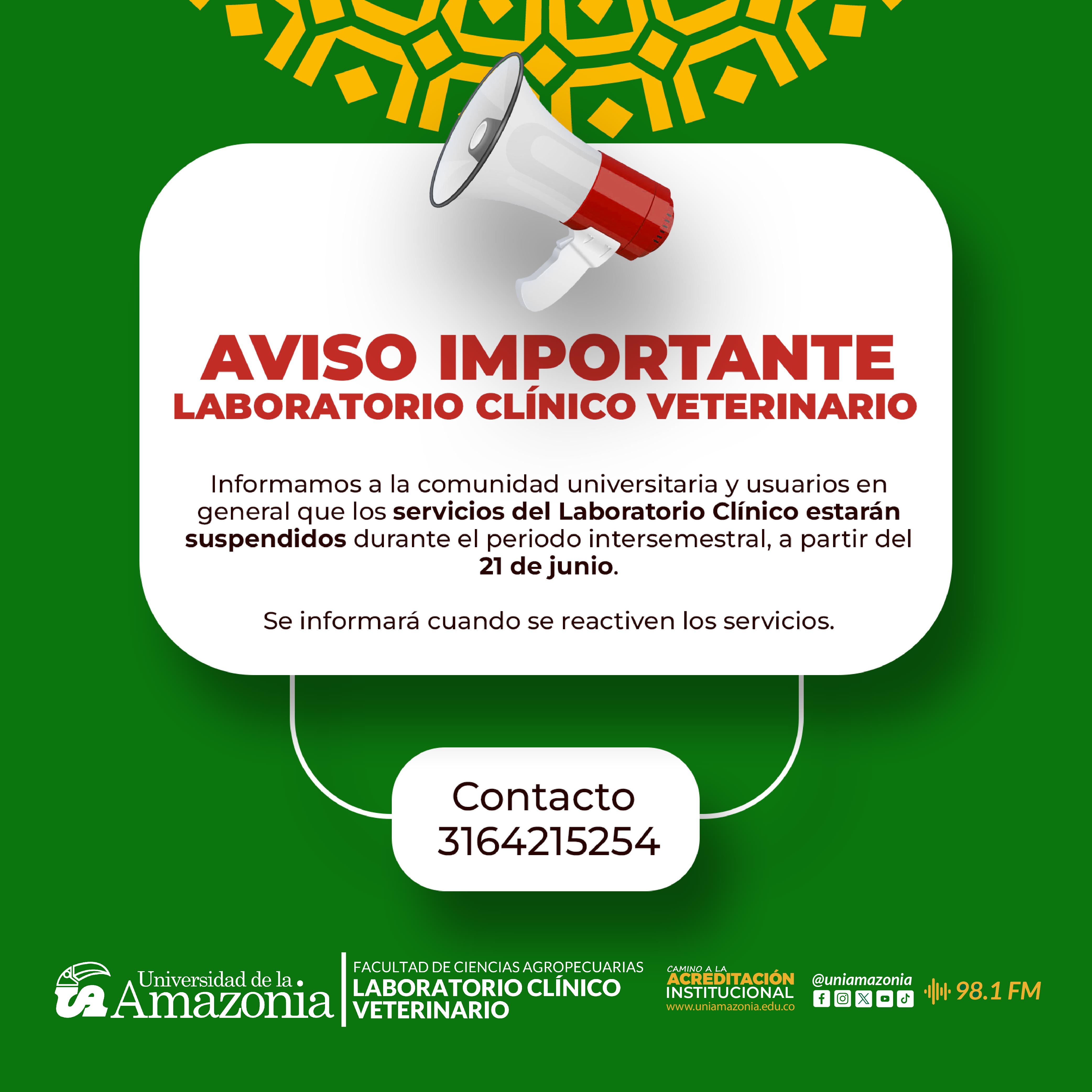 Informamos que los servicios del Laboratorio Clínico serán suspendidos a partir del 21 de junio debido al receso académico intersemestral. Les agradecemos su comprensión y les estaremos informando oportunamente cuando se reanuden las actividades.