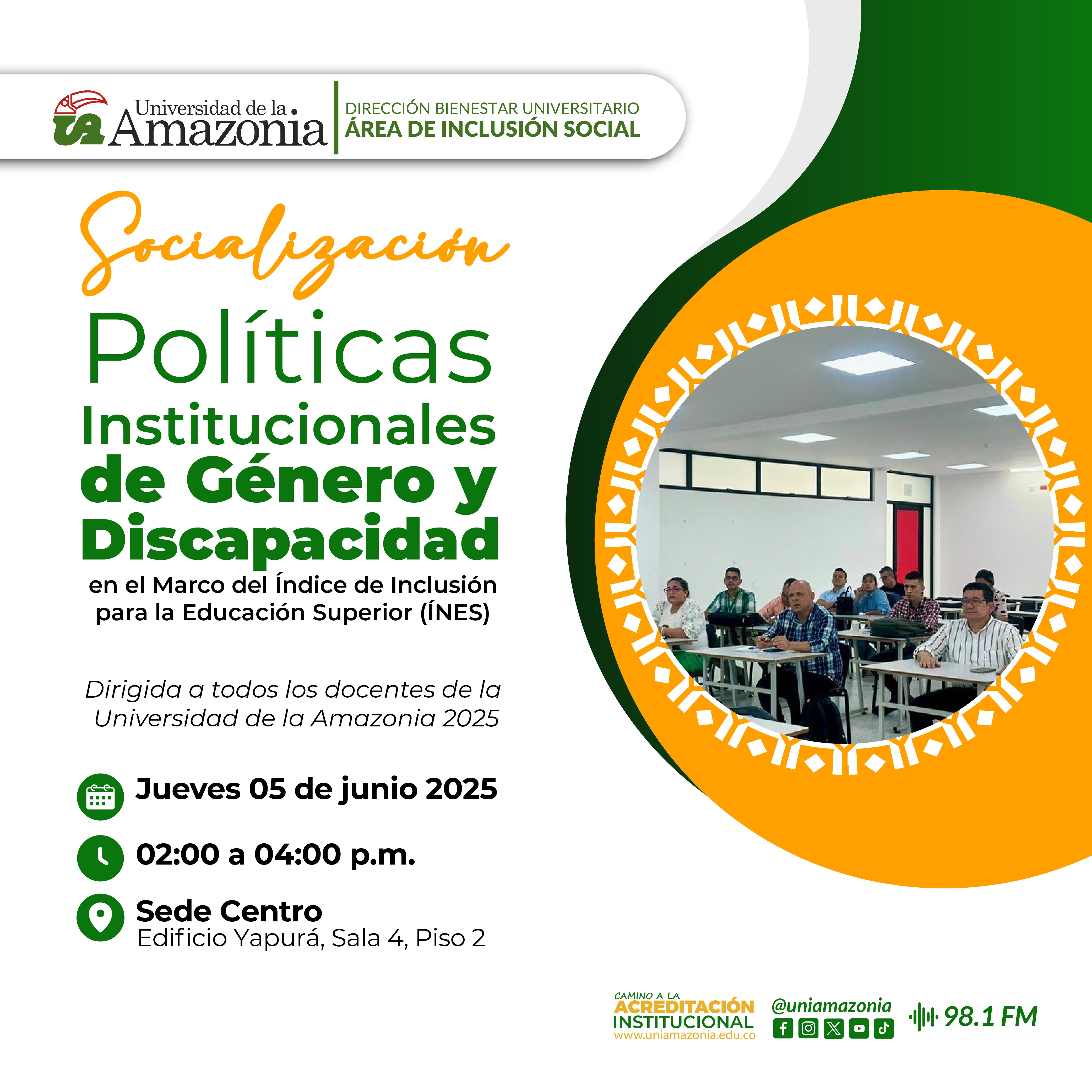 Docentes de la Universidad de la Amazonia, te invitamos a participar de la socialización de las políticas institucionales de género y discapacidad en el marco del Índice de Inclusión para la Educación Superior (INES).