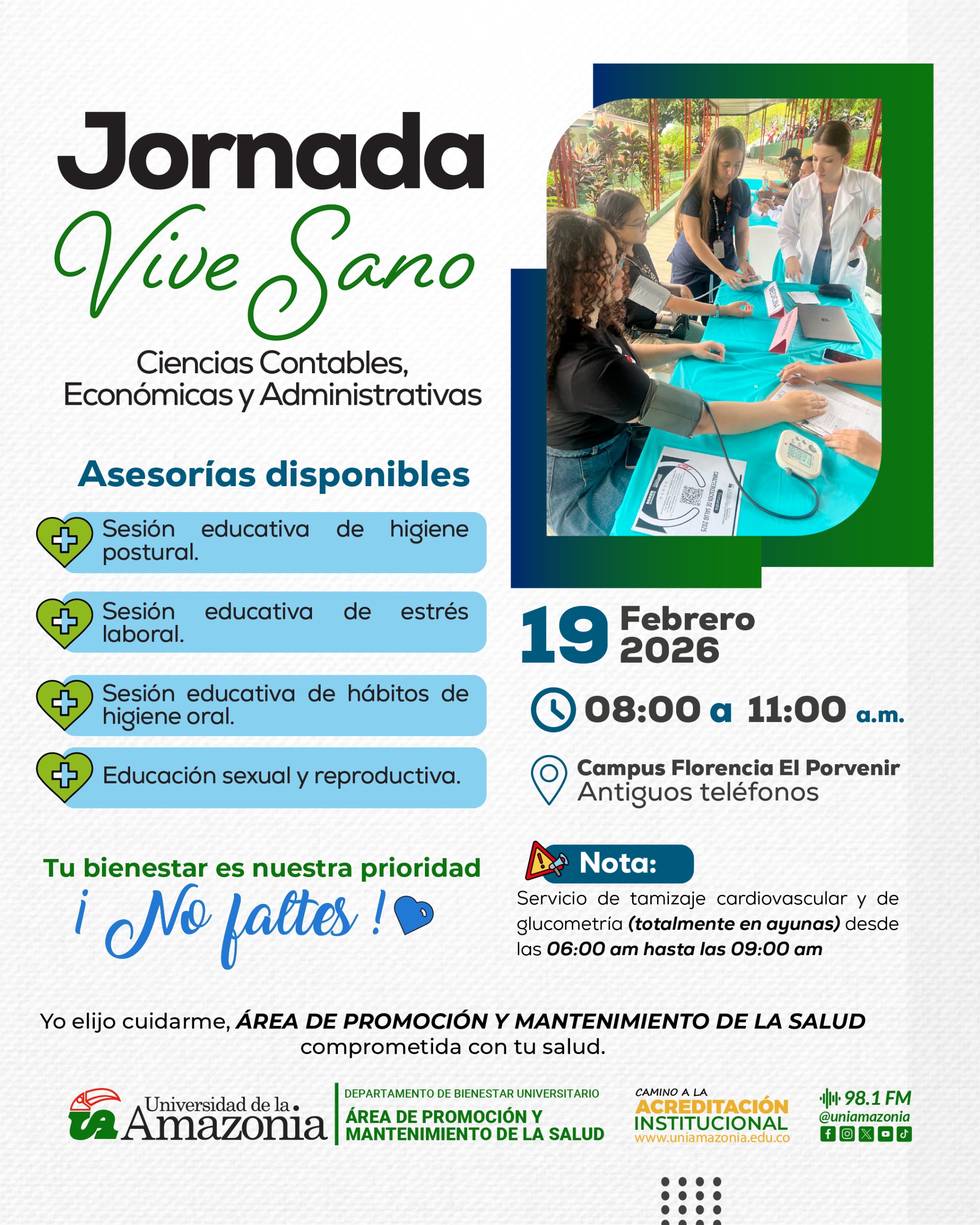 El Departamento de Bienestar Universitario, a través del área de Promoción y Mantenimiento de la Salud te invita a participar en nuestra jornada Vive Sano dirigida a todos los estudiantes de los programas académicos de Administración de Empresas y Contaduría Pública.
