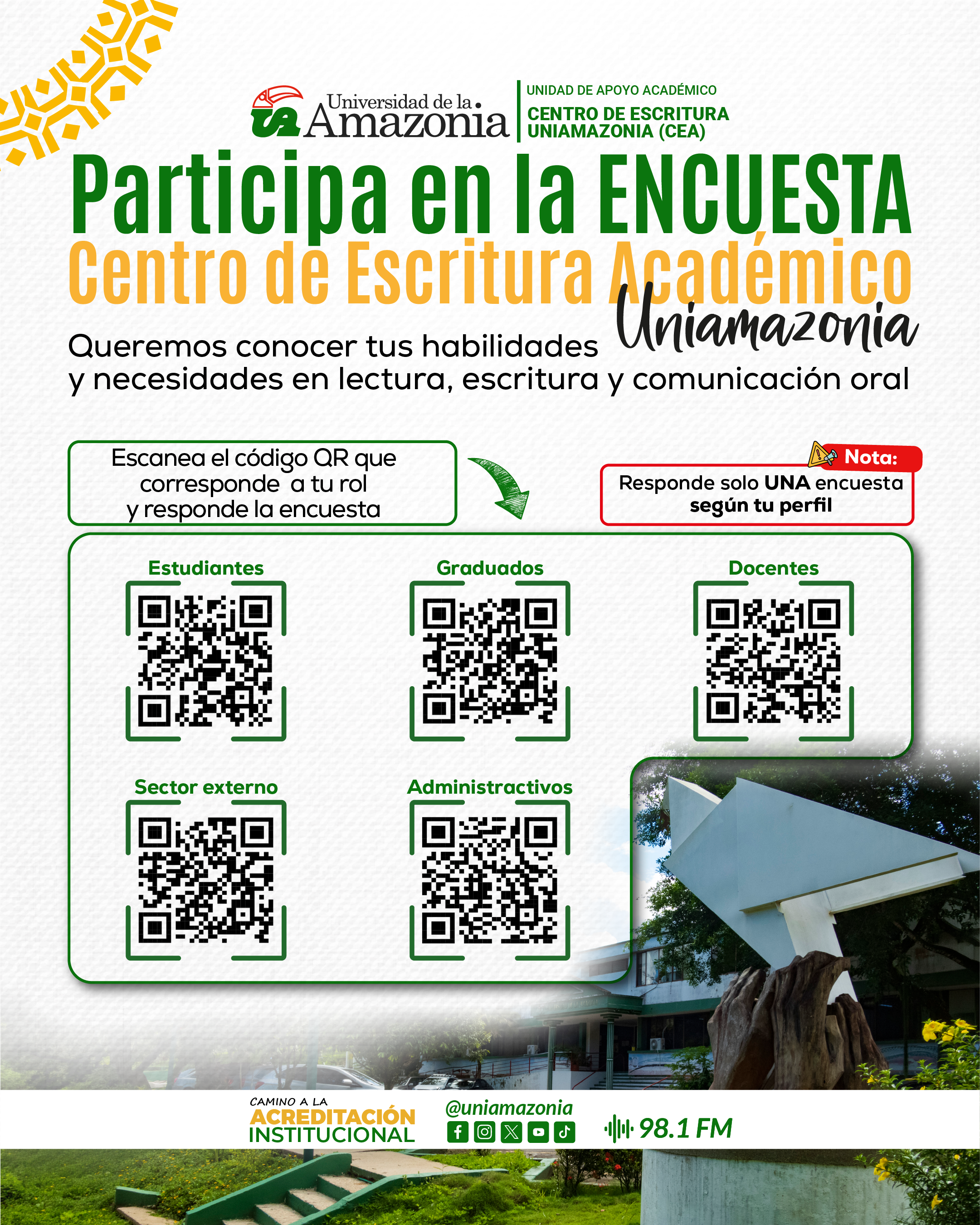 La Universidad de la Amazonia, a través del Centro de Escritura Académica (CEA), en articulación con el programa de Licenciatura en Literatura y Lengua Castellana, adscrito a la Facultad de Ciencias de la Educación, invita a estudiantes, docentes, administrativos, graduados y sector externo a participar en la encuesta de caracterización sobre habilidades en lectura, escritura y comunicación oral.