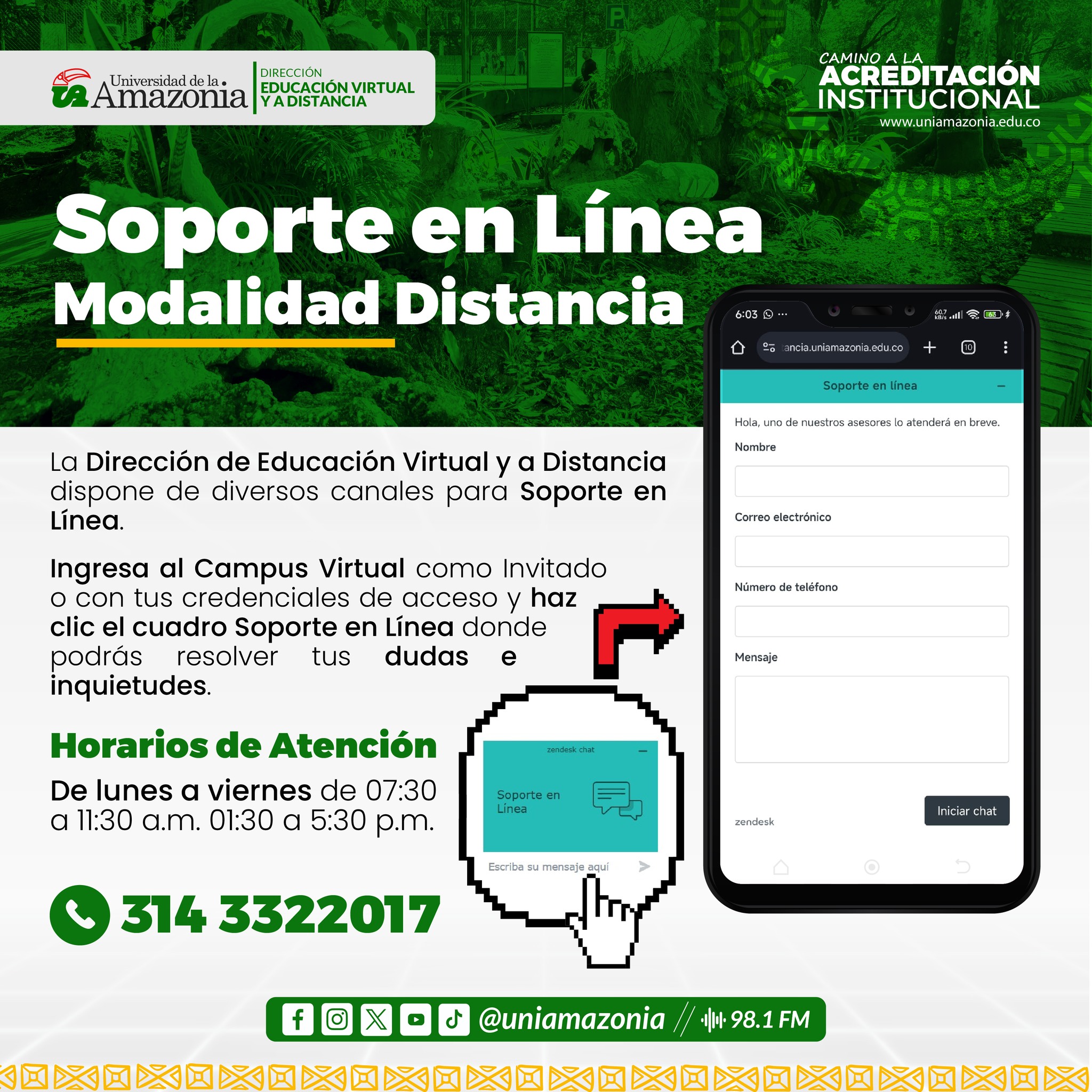 La Dirección de Educación Virtual y a Distancia pone a tu disposición canales de Soporte en Línea para resolver tus dudas de forma rápida y efectiva.