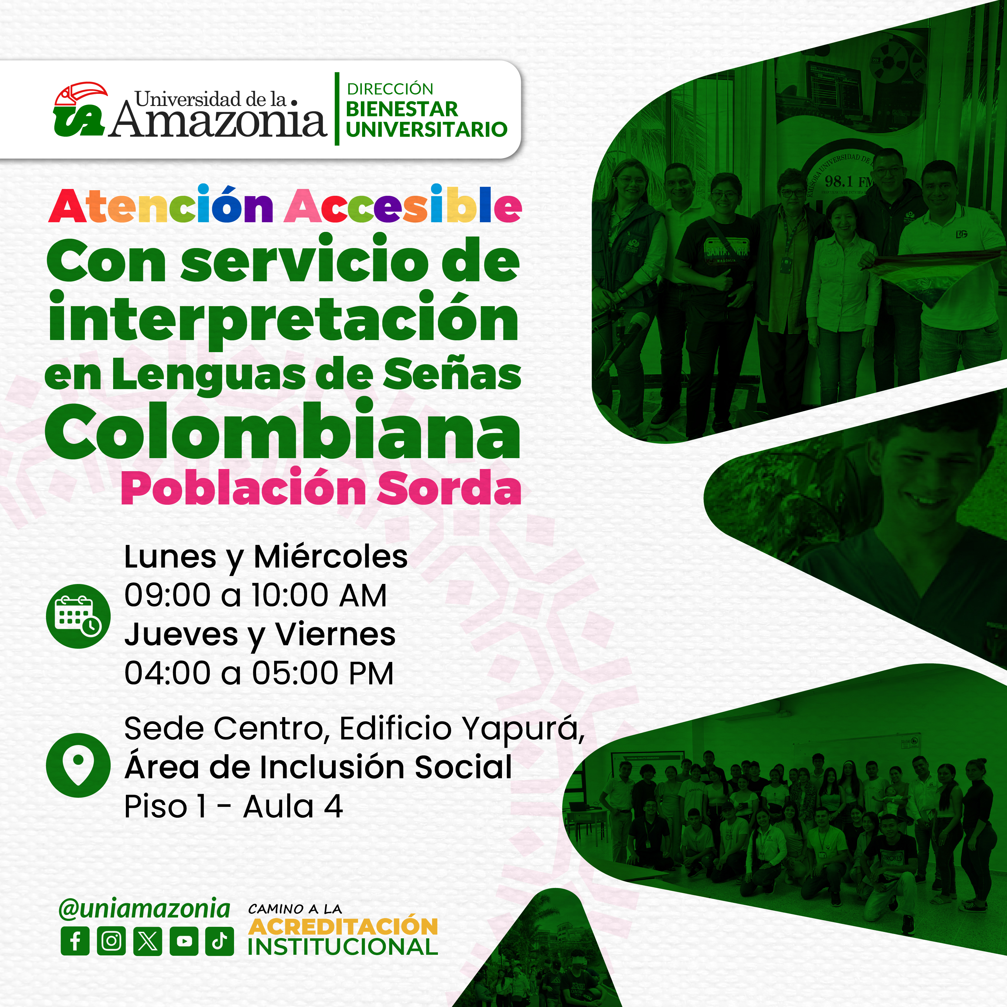 Desde la Dirección de Bienestar Universitario, el área de Inclusión Social ofrece a la comunidad Universitaria atención accesible con servicio de interpretación en Lenguas de Señas Colombiana a población estudiantil sorda.