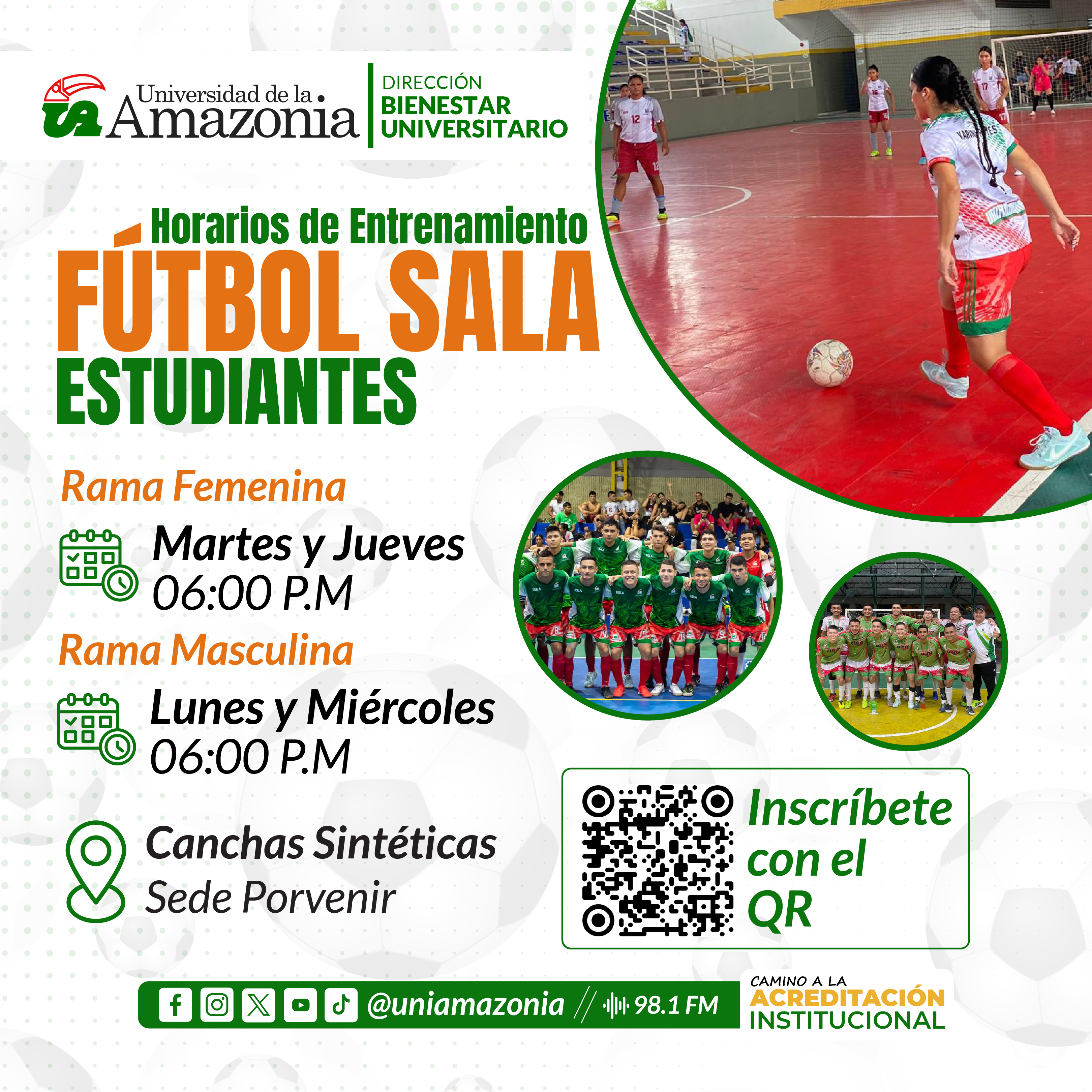 Consulta los horarios de entrenamiento de Fútbol sala para estudiantes y forma parte del equipo de la Universidad de la Amazonia.