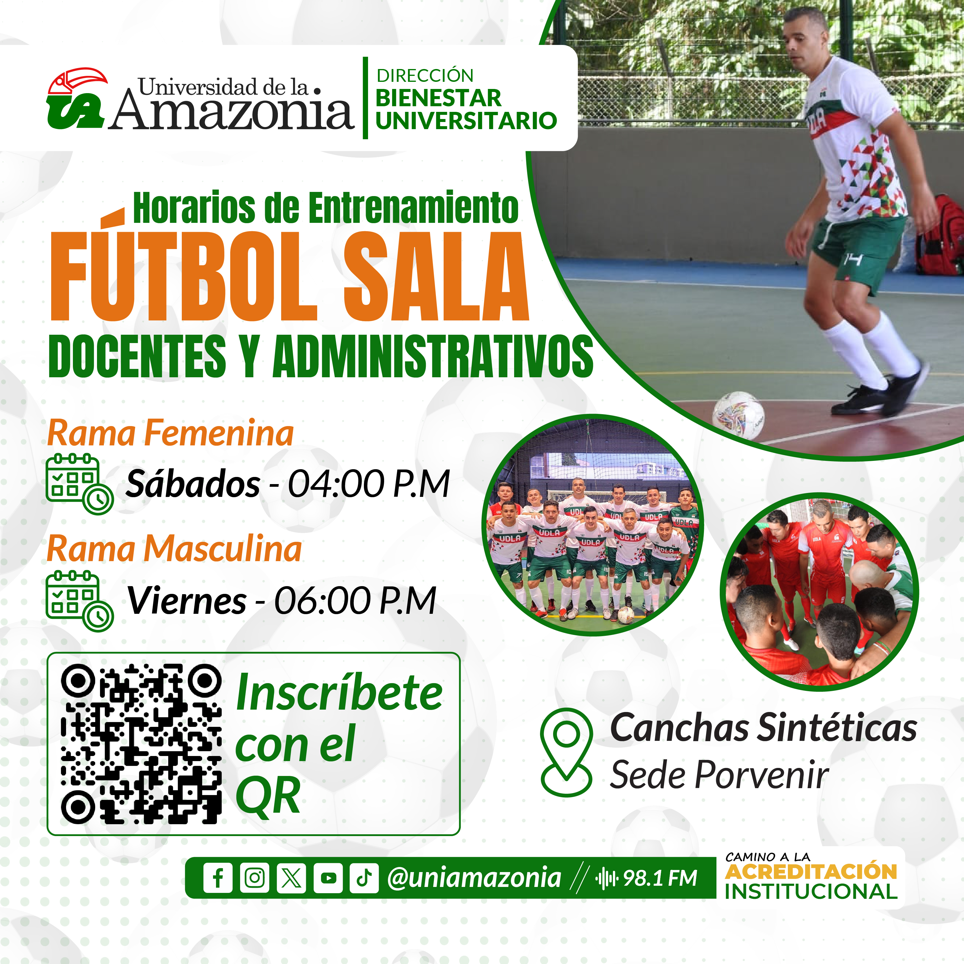 Consulta los horarios de entrenamiento de Fútbol Sala para docentes y administrativos y vive el deporte con la Universidad de la Amazonia.