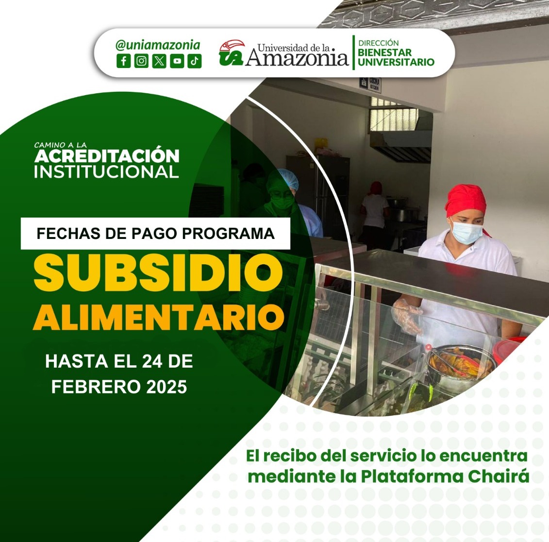 El programa Subsidio Alimentario, informa a la comunidad estudiantil de pregrado presencial Sede Florencia y Sede Guaviare, que la Plataforma Chairá se encuentra habilitada para realizar el pago correspondiente al mes de febrero y marzo.