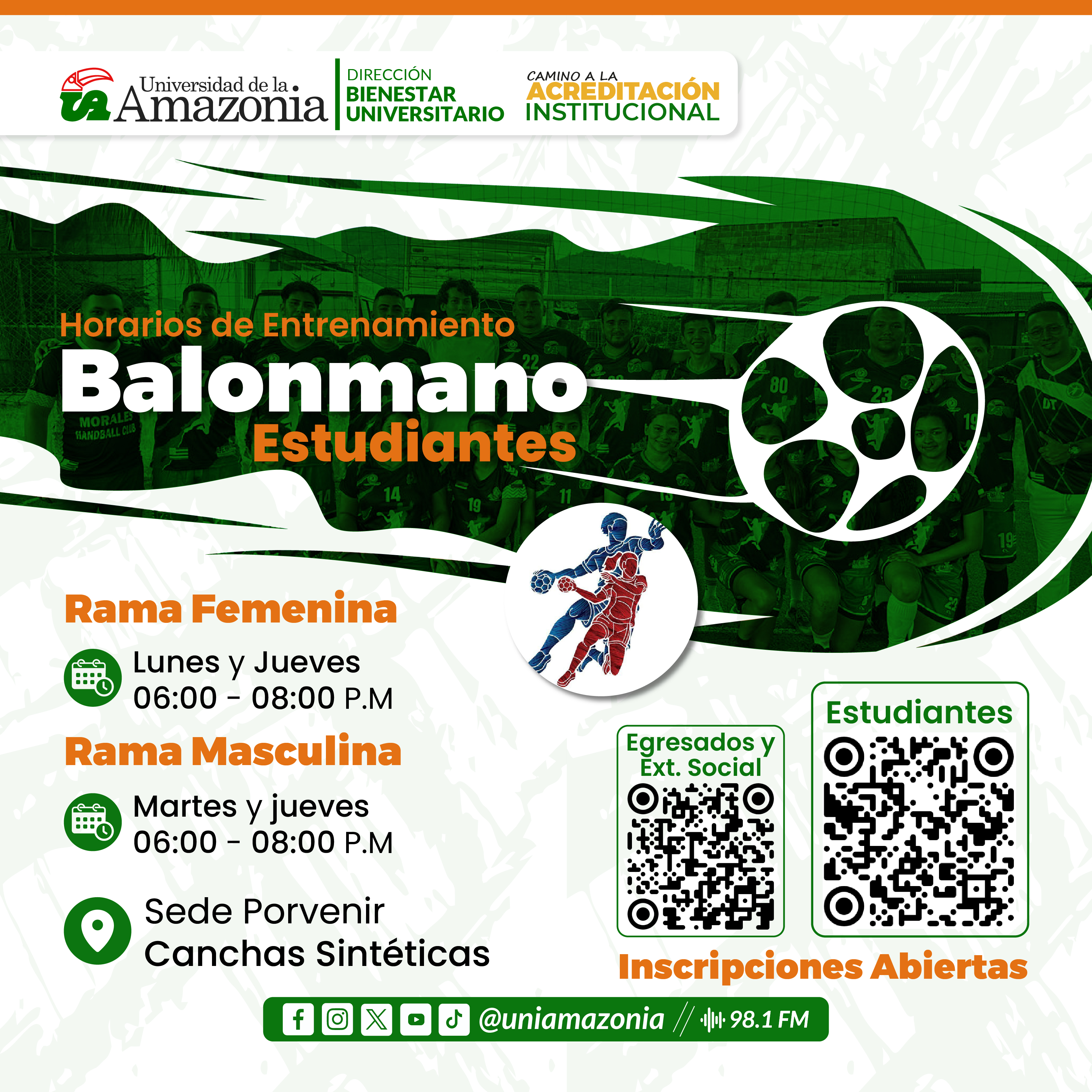 Consulta los horarios de entrenamiento de Balonmano y entrena con pasión en Universidad de la Amazonia.