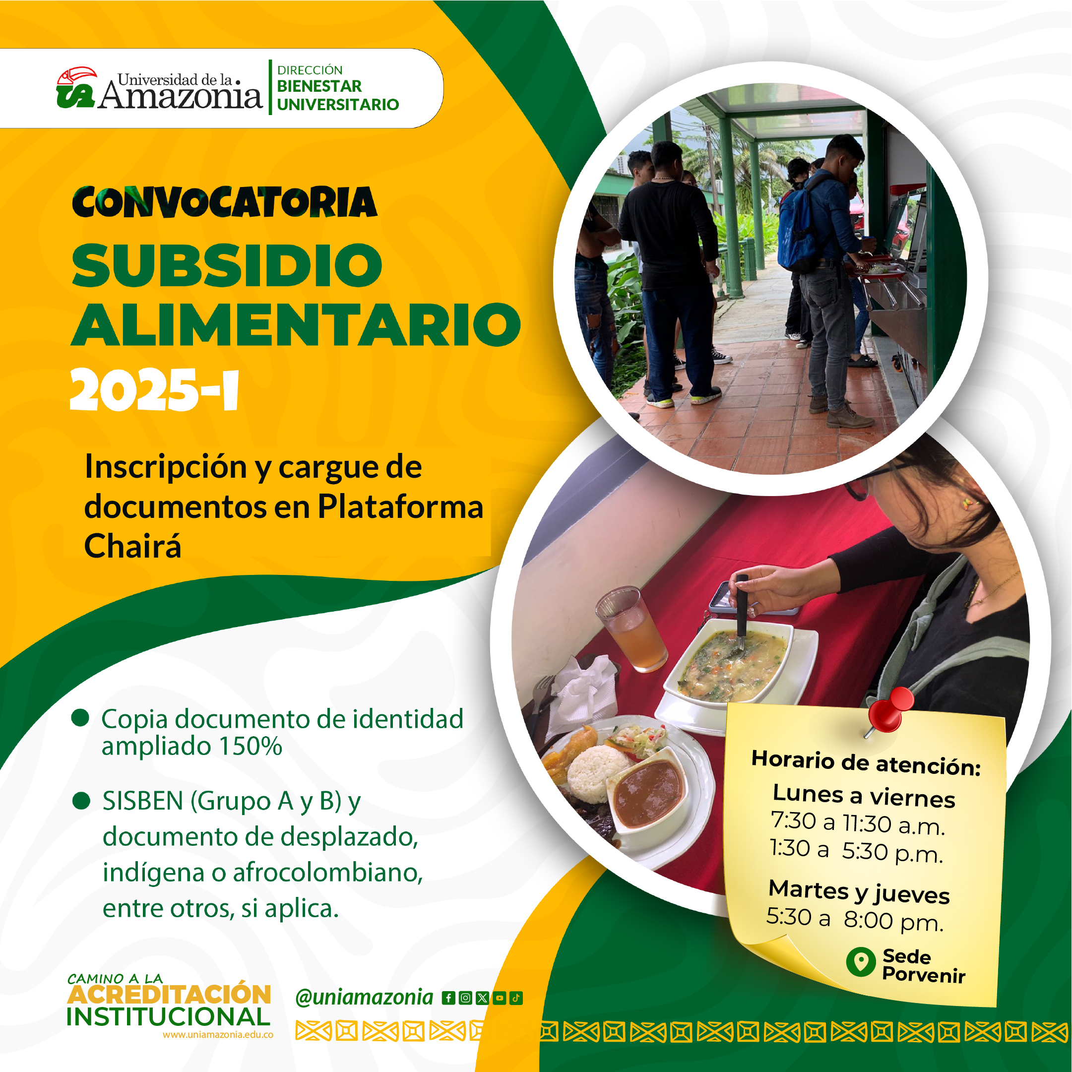 La Universidad de la Amazonia desde la Dirección de Bienestar Universitario, área de Promoción y Apoyo Socioeconómico, da a conocer a la comunidad estudiantil interesada, que se da inicio a la convocatoria del Programa Subsidio Alimentario